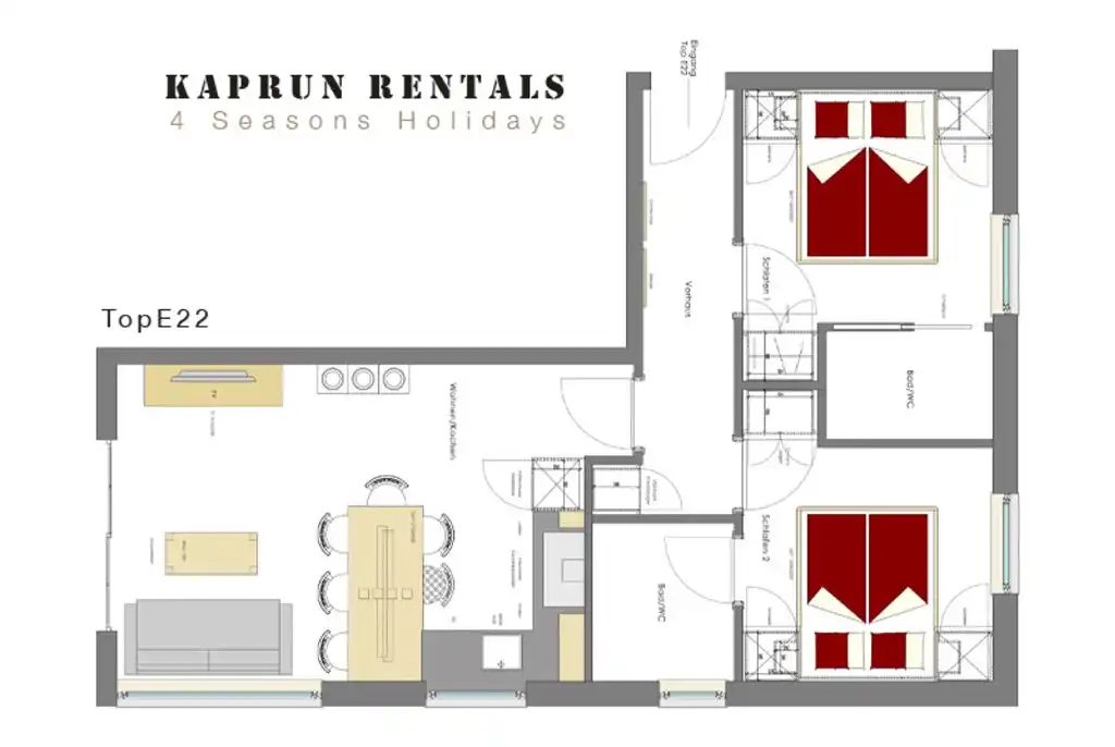 El apartamento Top E22 está ubicado en el segundo piso. Está lujosamente amueblado y totalmente equipado. El apartamento tiene dos dormitorios con lujosos baños contiguos; la sala de estar está amueblada de manera muy funcional con una cocina espaciosa y una sala de estar con sofá cama, lo que hace que el apartamento sea ideal para 6 personas. Desde la sala de estar tiene acceso directo al espacioso balcón de la esquina, donde tiene una hermosa vista del glaciar Kaprun.