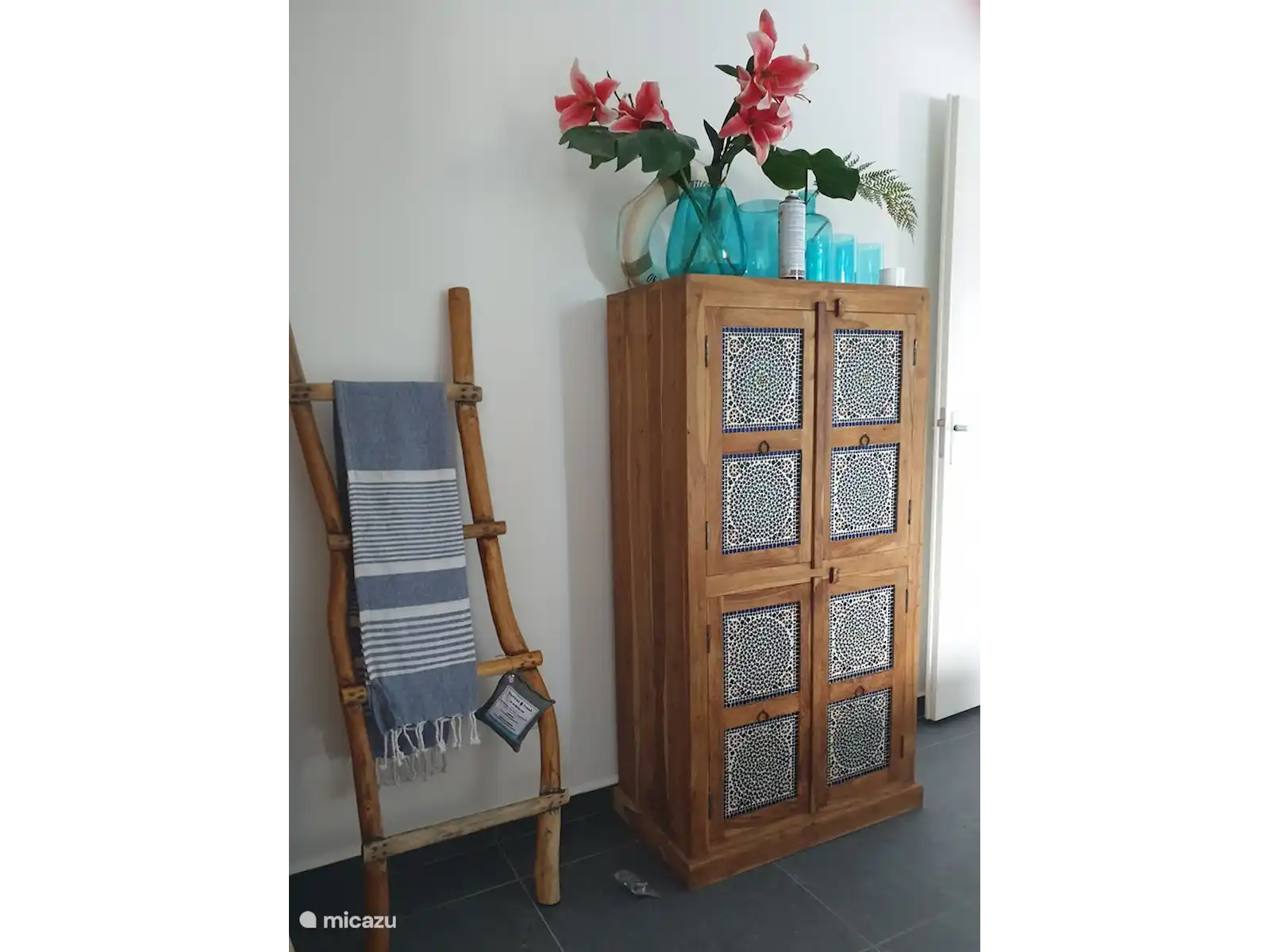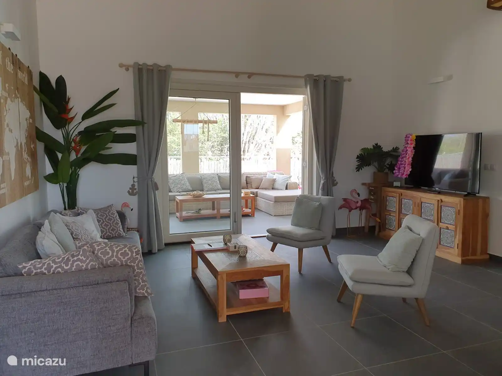 En la parte trasera de la casa se encuentra la piscina privada y un precioso salón al aire libre bajo el porche cubierto. Alrededor de la piscina hay una amplia terraza con preciosas tumbonas y una ducha al aire libre. La parte trasera de la casa está ubicada en un pedazo de naturaleza virgen para brindar paz y privacidad.