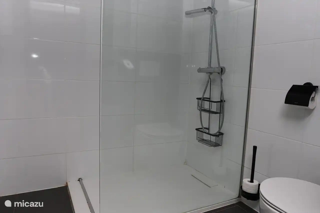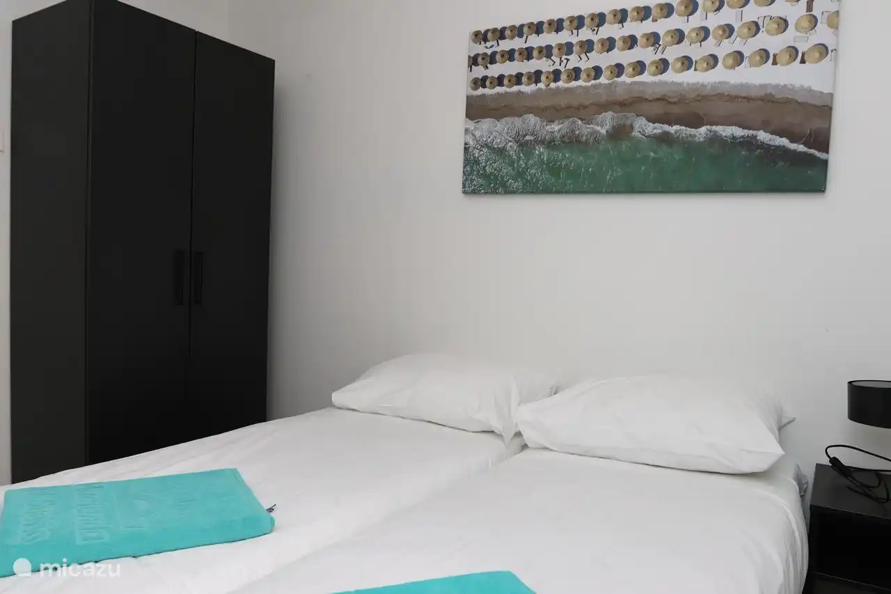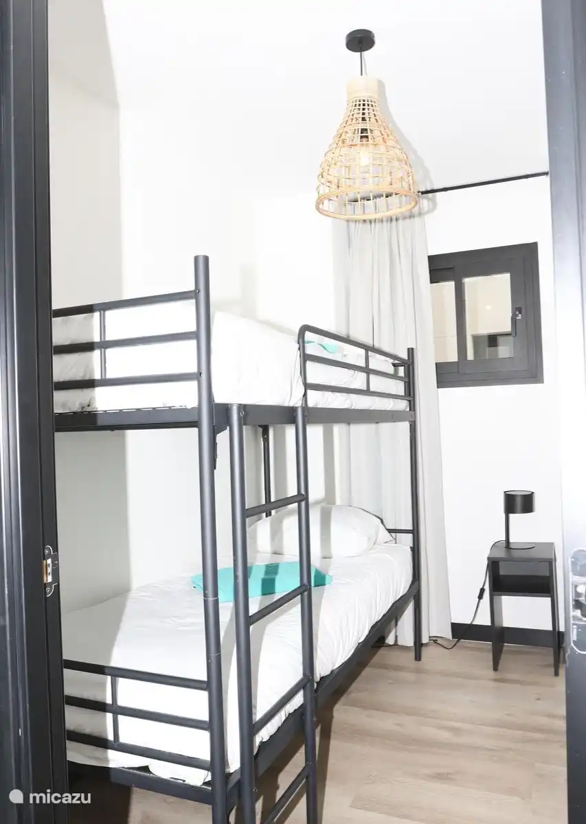 El apartamento tiene tres dormitorios, uno con litera. Un baño con inodoro y ducha. salón con cocina abierta con todas las comodidades. La superficie es de unos 78 m2, además de un jardín y una terraza, y vistas a la piscina general climatizada.