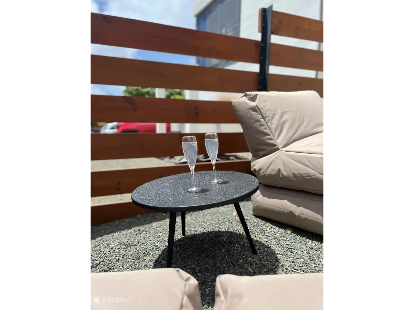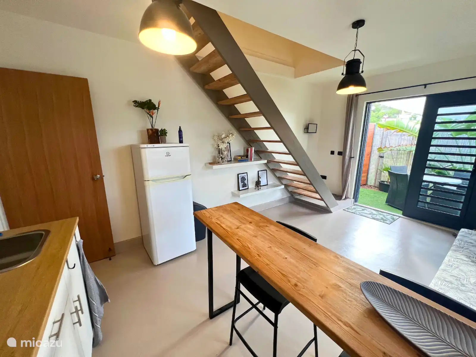 - Salón y cocina. En la planta baja tiene una sala de estar con ventilador y una pequeña cocina con máquina Nespresso, tostadora, hervidor de agua, estufa y horno.