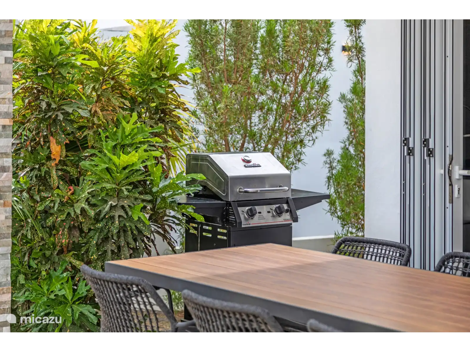 A través de las puertas correderas se entra directamente a la terraza cubierta, donde puedes disfrutar de una copa, una comida o una acogedora barbacoa. En el jardín hay una piscina privada, ideal para refrescarse en días calurosos o relajarse bajo la palapa.