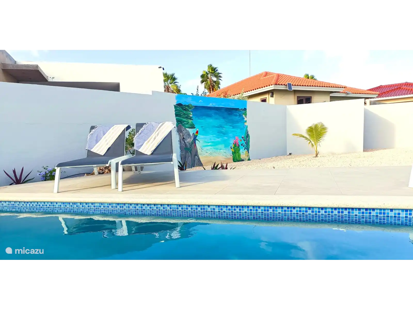 Disfruta de total privacidad en el amplio jardín amurallado con una gran piscina privada (3 x 7 m). Relájate en la soleada terraza de la piscina o bajo el gran porche cubierto con mesa de comedor y cómodo salón, perfecto para largas veladas tropicales.