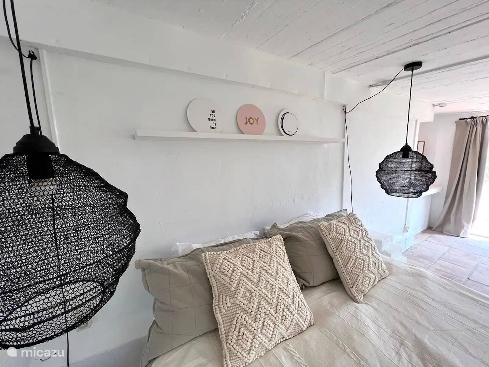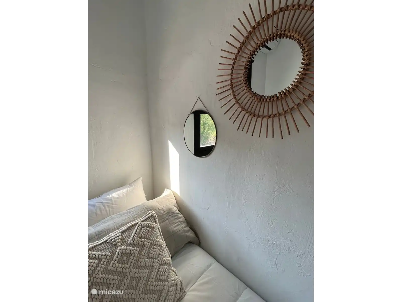 La casita es una casa doble independiente (aprox. 16 m2) situada en el jardín del patio. Hay un dormitorio con una cama matrimonial de 180 x 200. Un baño con ducha a pie de piel, inodoro y lavabo.