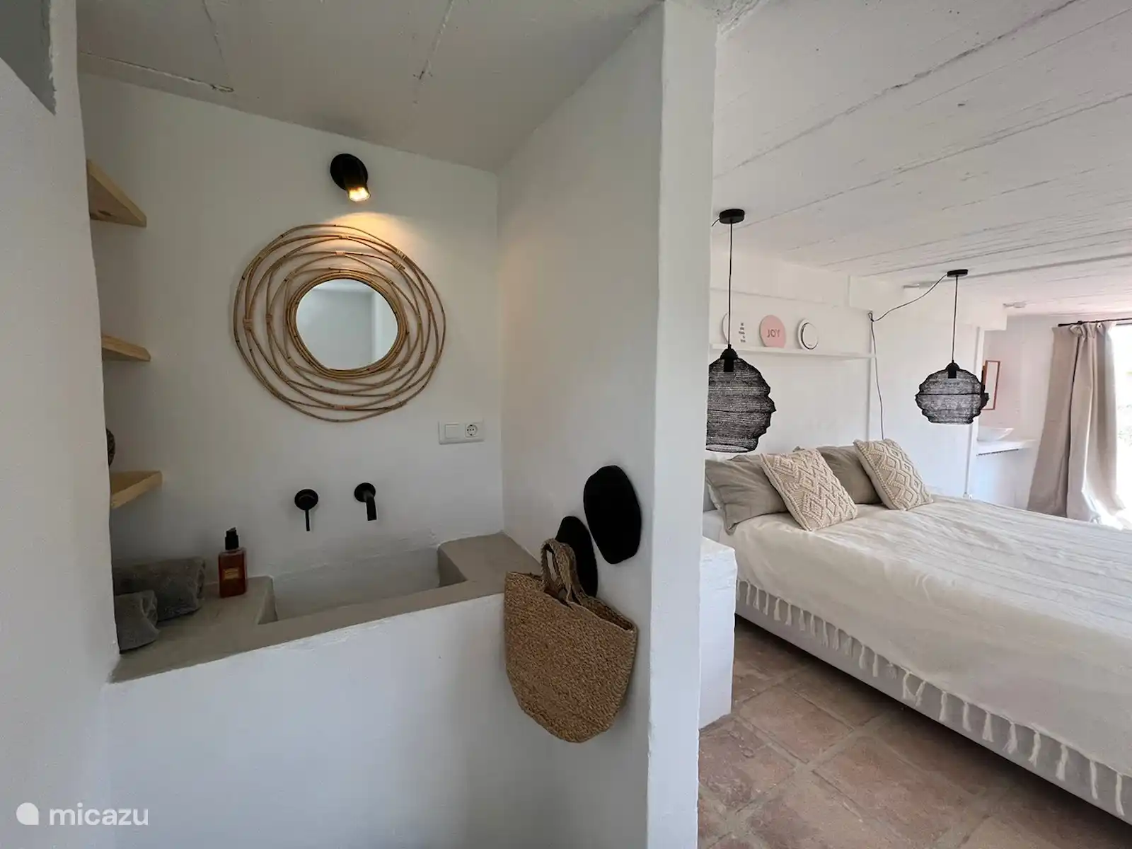 Esta casita está situada bajo la terraza de la piscina. Tiene unos 30 m2 y consta de una zona para estar y dormir con una cama doble de 180 x 200. Un baño con ducha a pie de piel, inodoro y lavabo. Dispone de una amplia terraza privada.