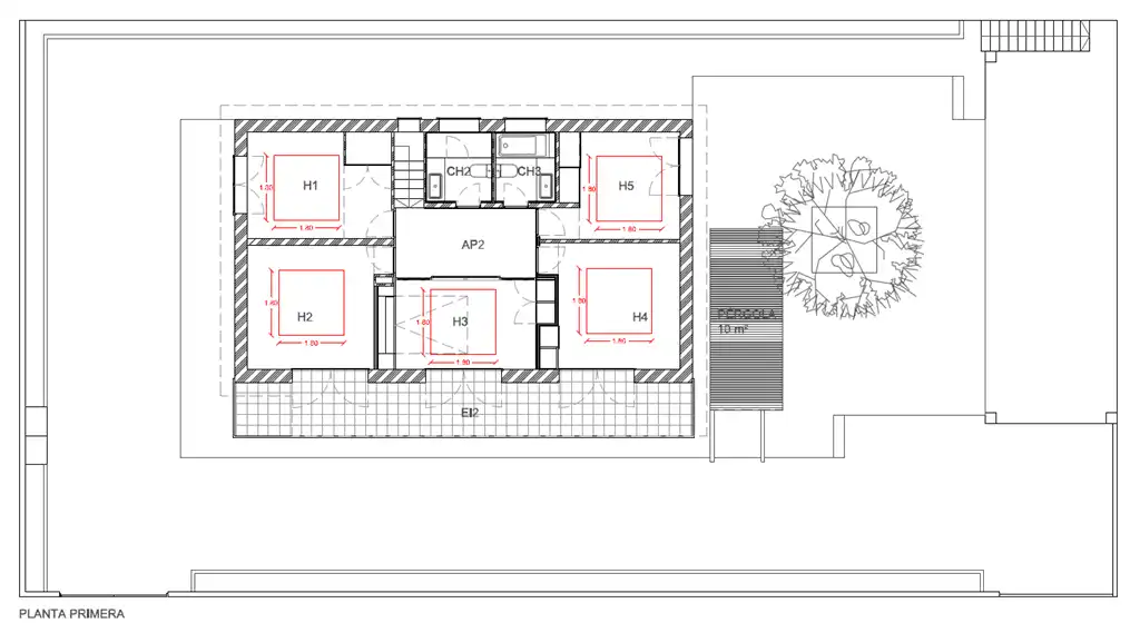 La villa tiene cinco dormitorios (10 personas para dormir) en la primera planta, así como dos baños.