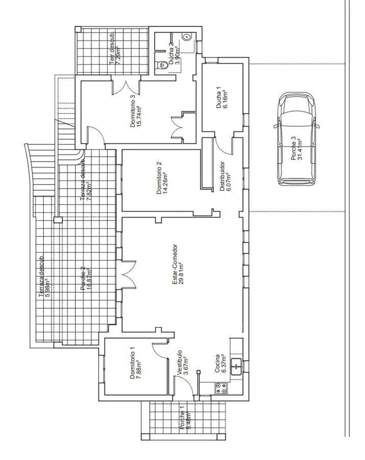 La casa está situada en un amplio terreno de casi 1000 m2 y cuenta con un garaje cubierto y un amplio camino de entrada con llave.
