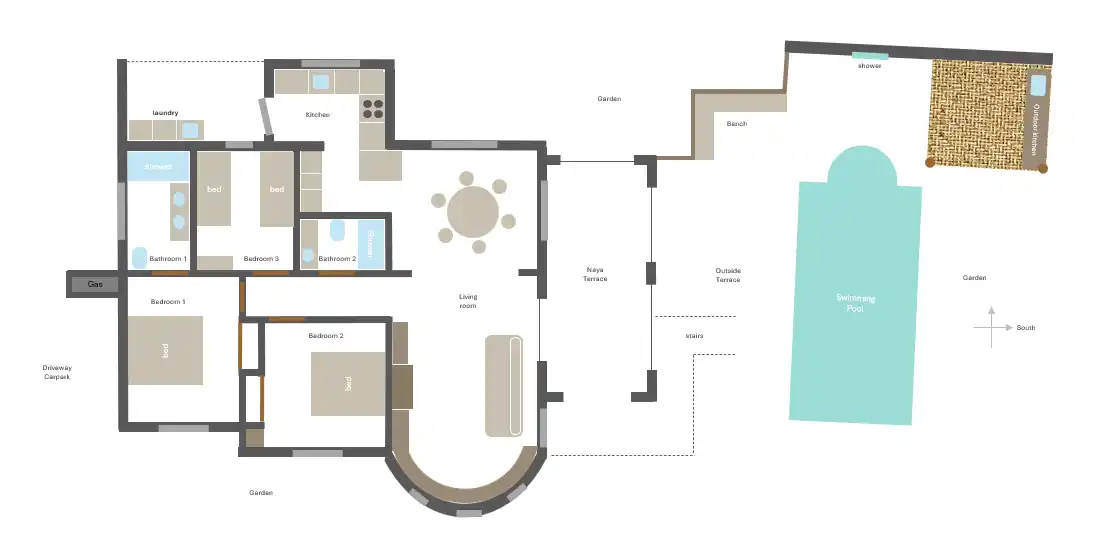 En el exterior, te espera una piscina privada, ideal para un baño refrescante o para relajarte en las tumbonas. Junto a la piscina encontrarás una terraza cubierta con una cocina exterior totalmente equipada y barbacoa de gas y nevera — perfecta para noches largas y acogedoras.