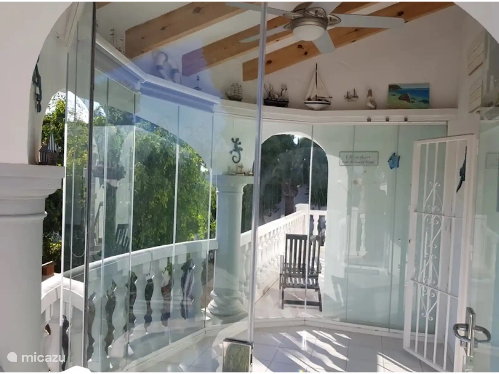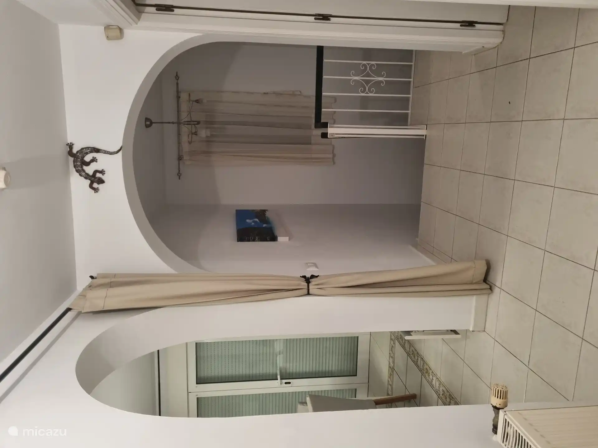 La entrada está en la planta superior. Aquí hay un baño separado. También encontrará el comedor / sala de estar y una cocina abierta. La cocina está equipada con nevera grande, microondas y horno. En la sala de estar hay una acogedora chimenea eléctrica. Junto a él hay un amplio invernadero que se puede cerrar completamente mediante vidrio. Desde el invernadero hay una vista al mar. Desde el invernadero hay una escalera al jardín. Una escalera interior desde el pasillo también conduce a la planta baja. El dormitorio 1 tiene 2 camas individuales y un baño muy amplio (lavabo, bañera, ducha e inodoro) en suite. La habitación tiene aire acondicionado. Esta habitación también tiene acceso directo al balcón contiguo. El dormitorio 2 tiene una litera. Todas las camas son de tamaño 90x200cm.