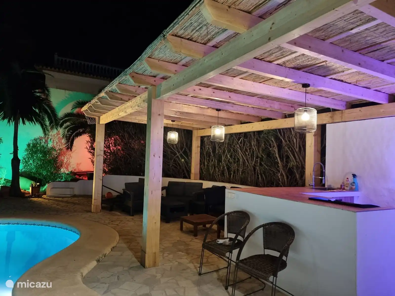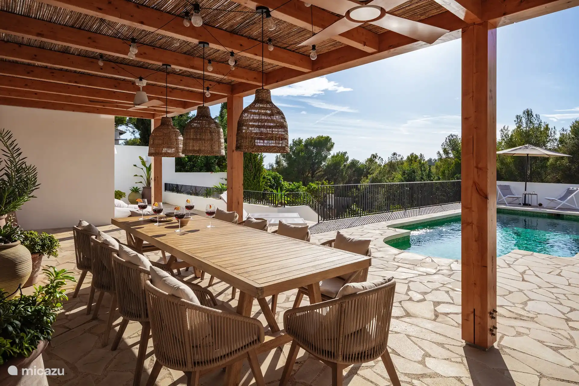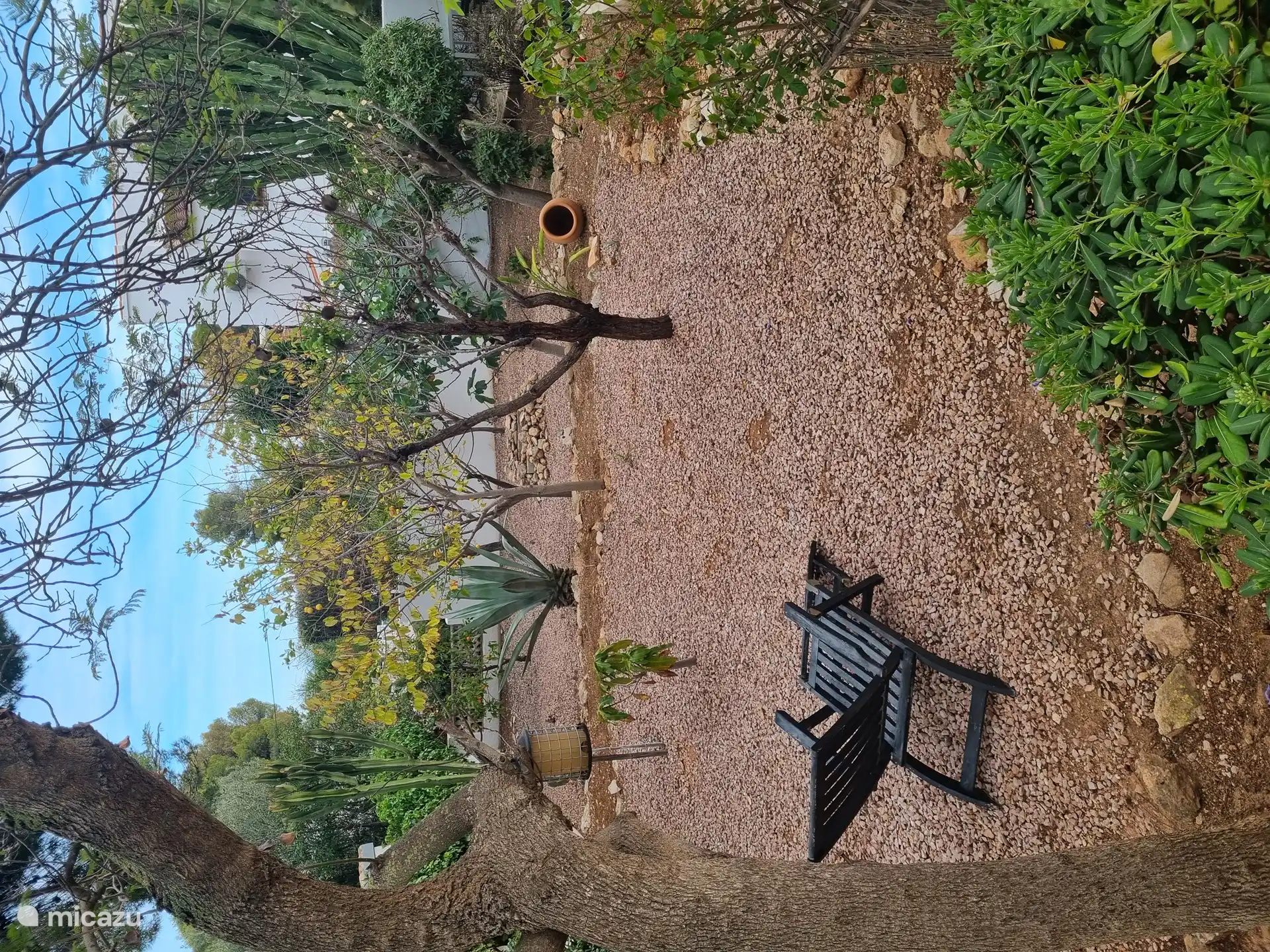 Desde la planta baja se accede primero a una zona de estar cubierta con tumbonas. En el jardín hay una amplia piscina en forma de riñón con una escalera en el agua. La parte más profunda tiene más de 2 metros de profundidad. Hay una cocina exterior de construcción muy reciente con sala de estar donde puede cocinar y sentarse cómodamente. El jardín está equipado con muchas tumbonas, sillas y sombrillas. También hay una mesa de ping-pong y una canasta de baloncesto. En el resto del jardín encontrará muchos árboles frutales y hermosas plantas mediterráneas.