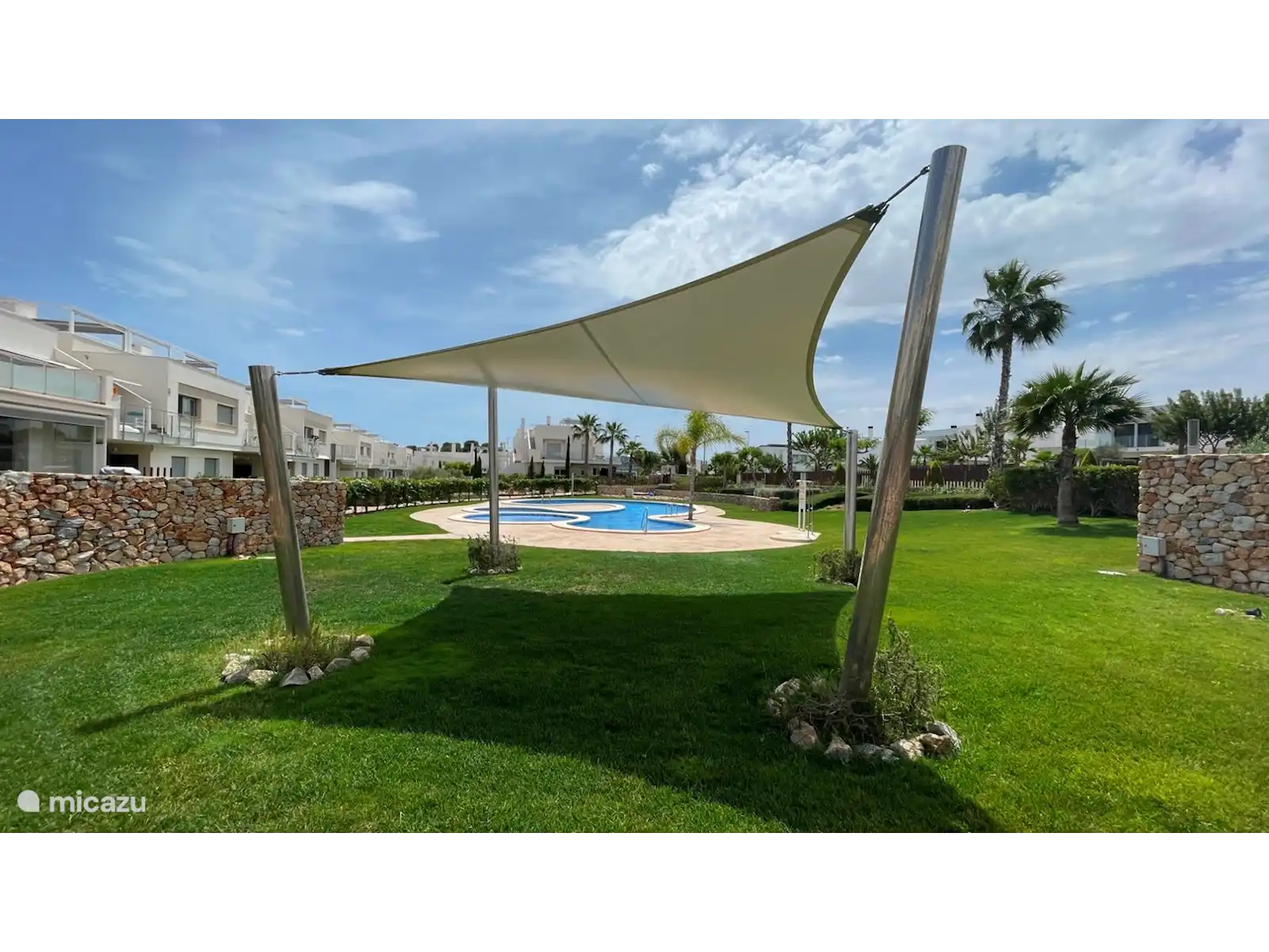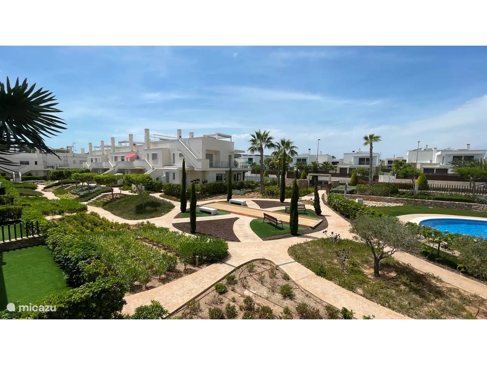 A través del hermoso jardín comunitario se llega a la piscina con zona infantil separada y bañera de hidromasaje. El jardín también cuenta con una pista de petanca.