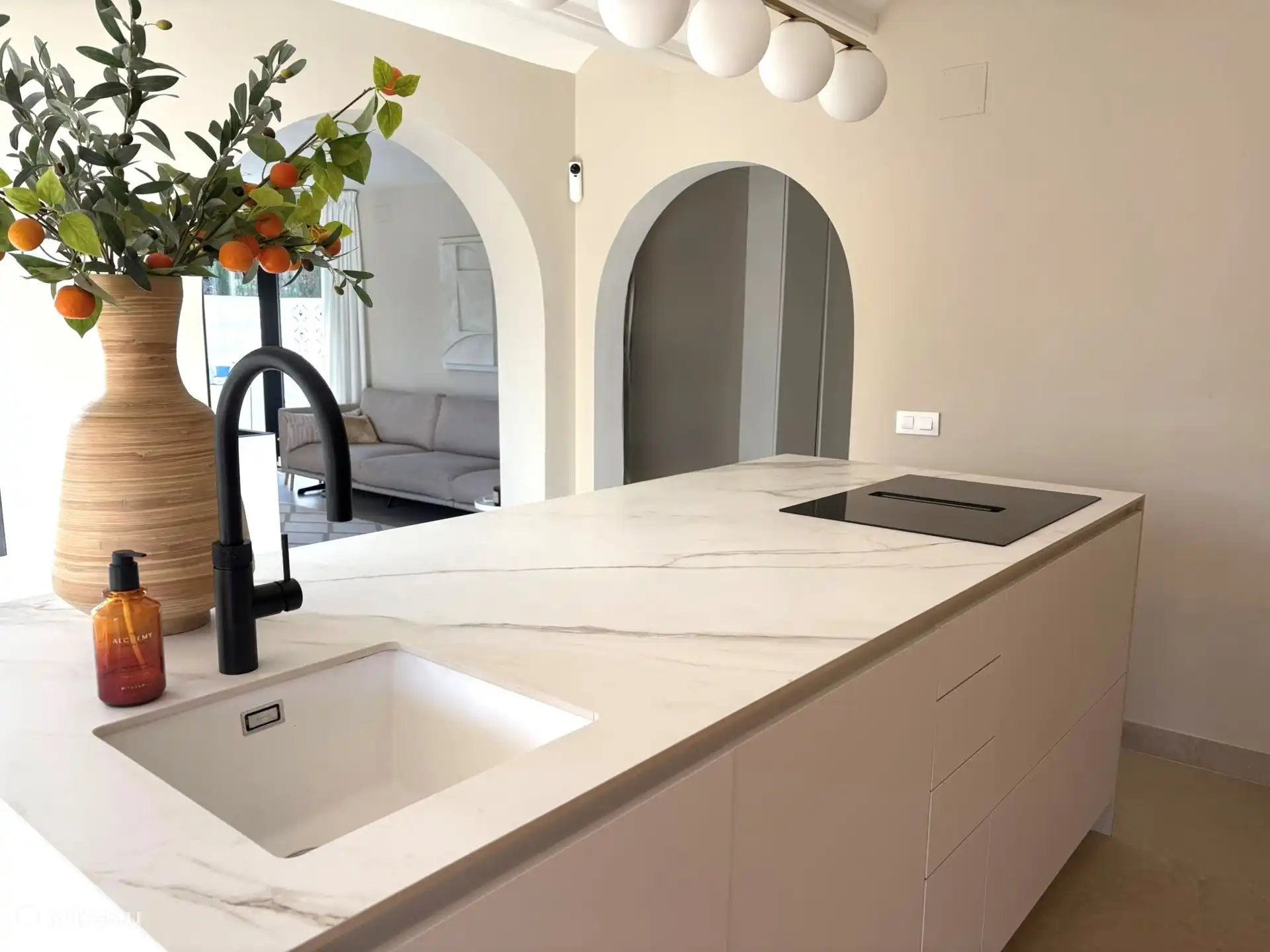 La espaciosa cocina de esquina está totalmente equipada, incluyendo: vajilla, cubiertos, vasos, tazas, sartenes y toallas y paños de cocina. La cocina también está totalmente equipada, como: una cafetera L'OR Nespresso, hervidor de agua, tostadora, horno separado, microondas separado, lavavajillas, vitrocerámica de 3 quemadores y nevera / congelador.