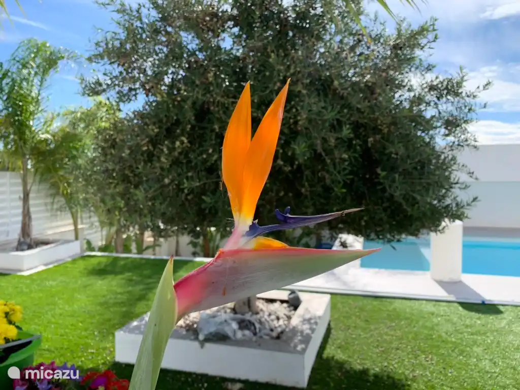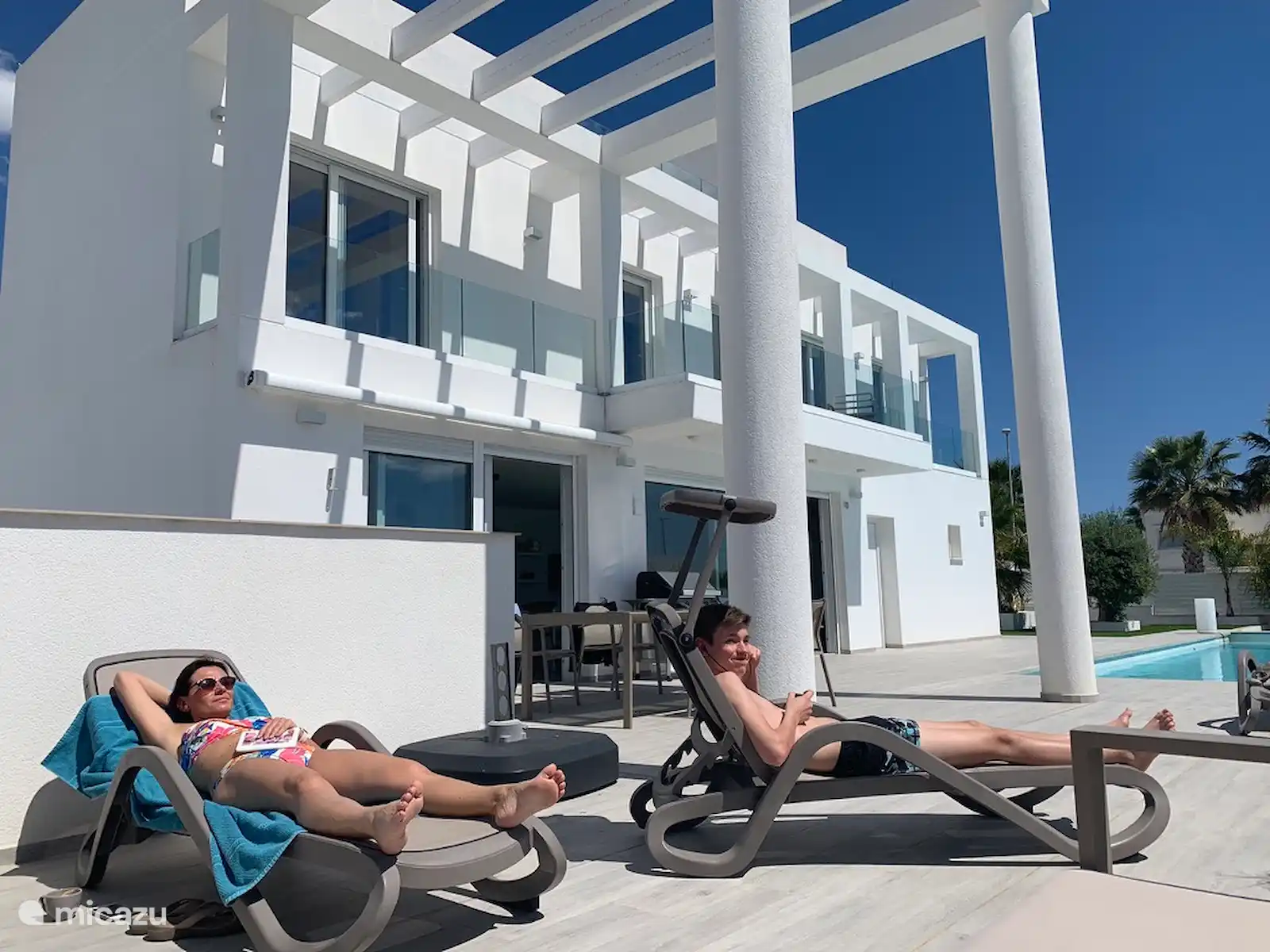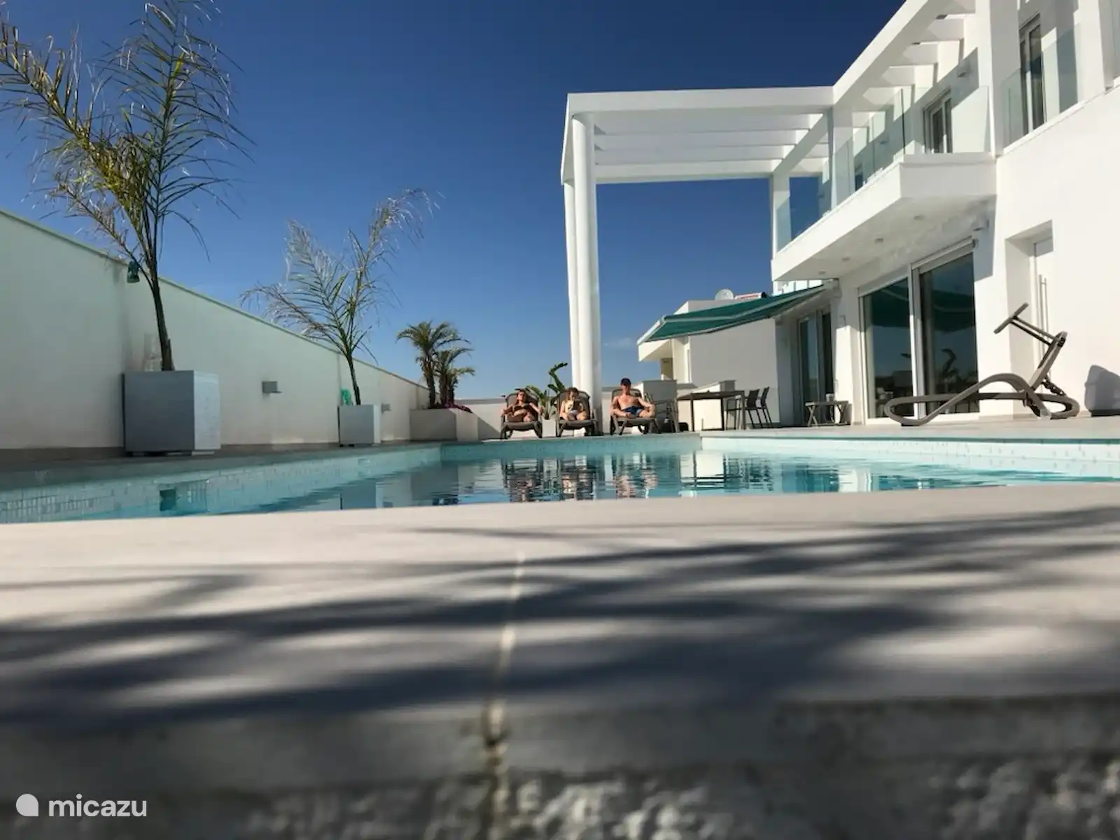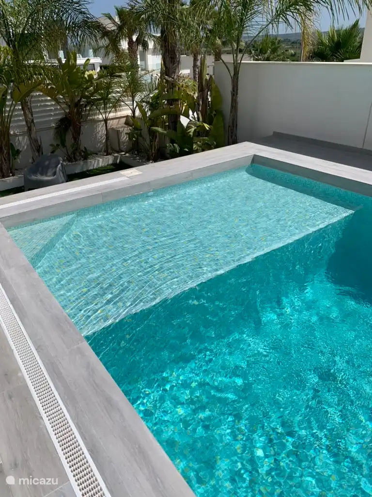 Hogar exclusivo y moderno, tanto por dentro como por fuera. Hay una gran piscina privada de 12 por 4 metros con una zona poco profunda (playa). Desde la primera planta y el solárium (segundo piso) se tiene una vista al valle de San Fulgencio.