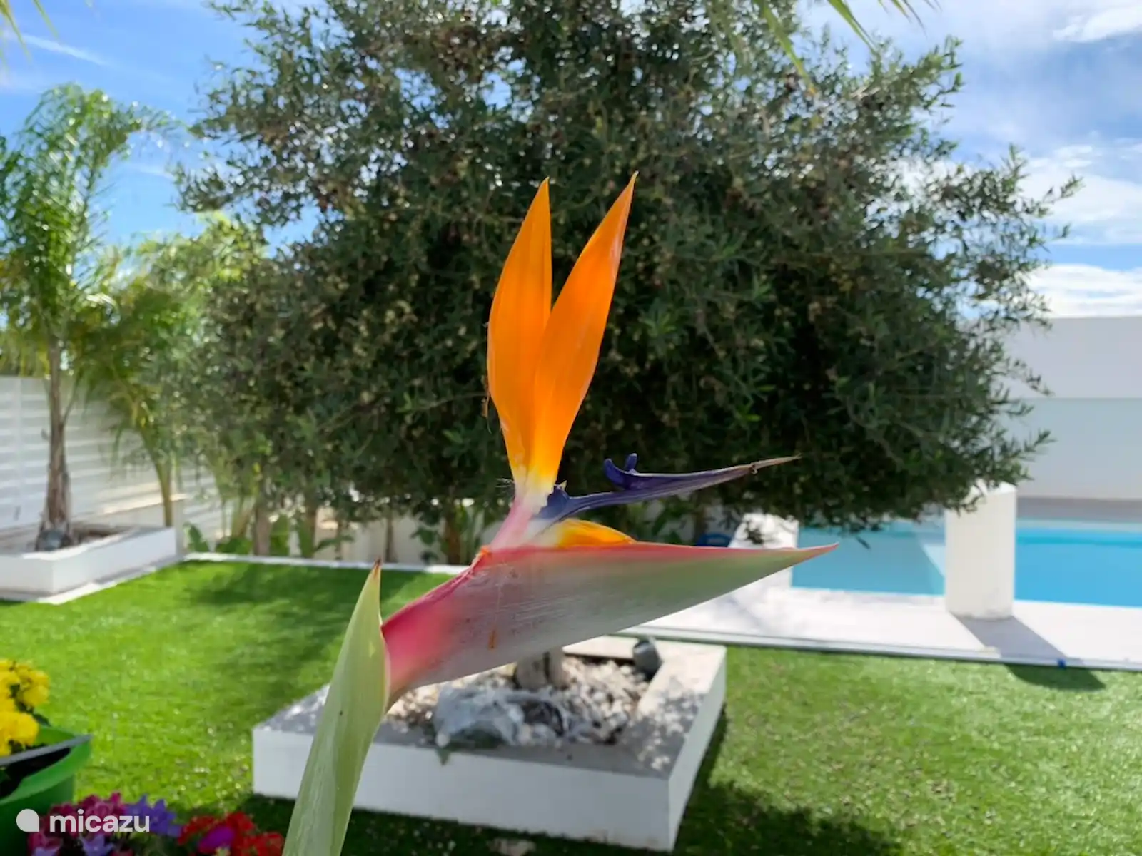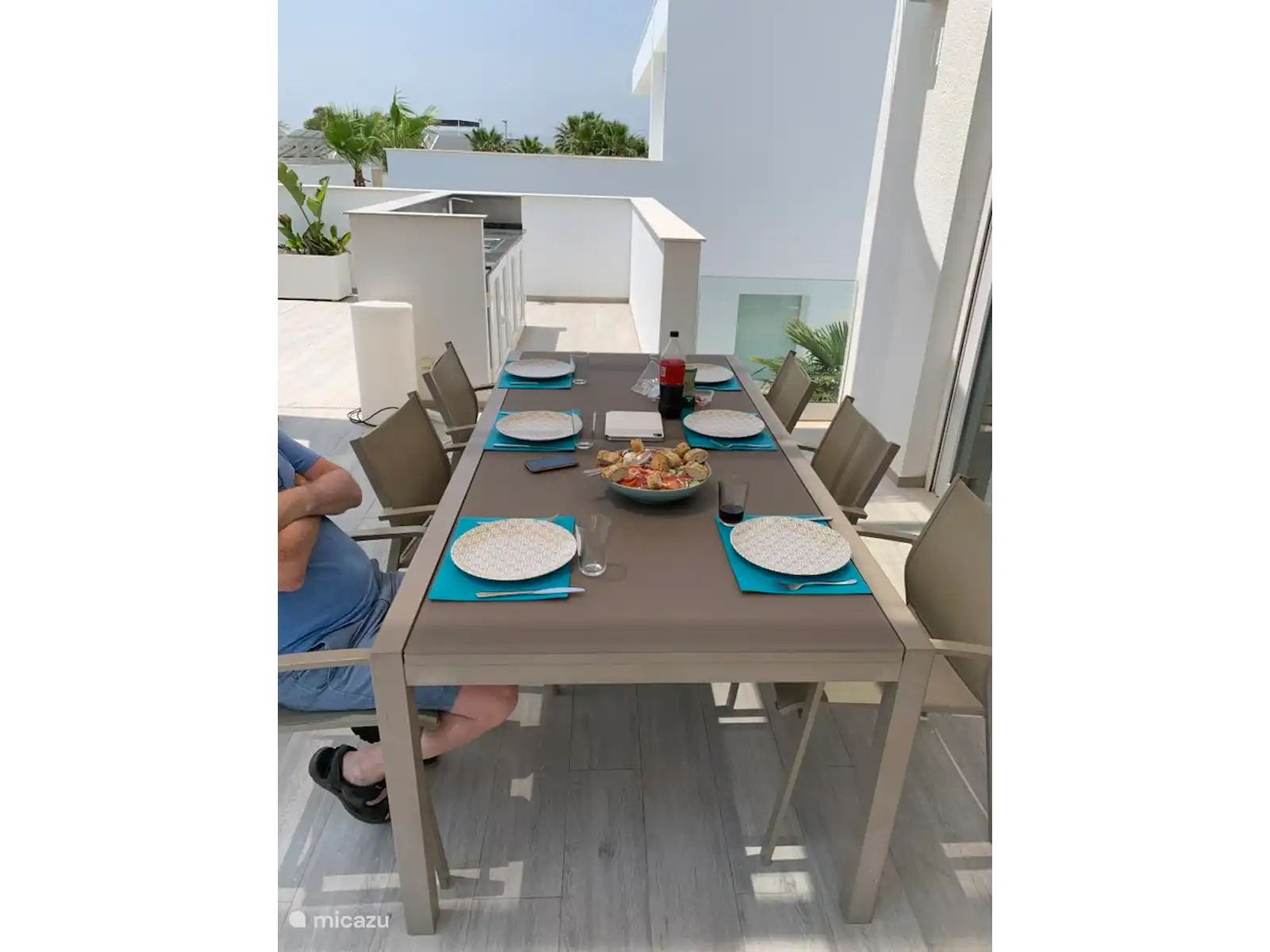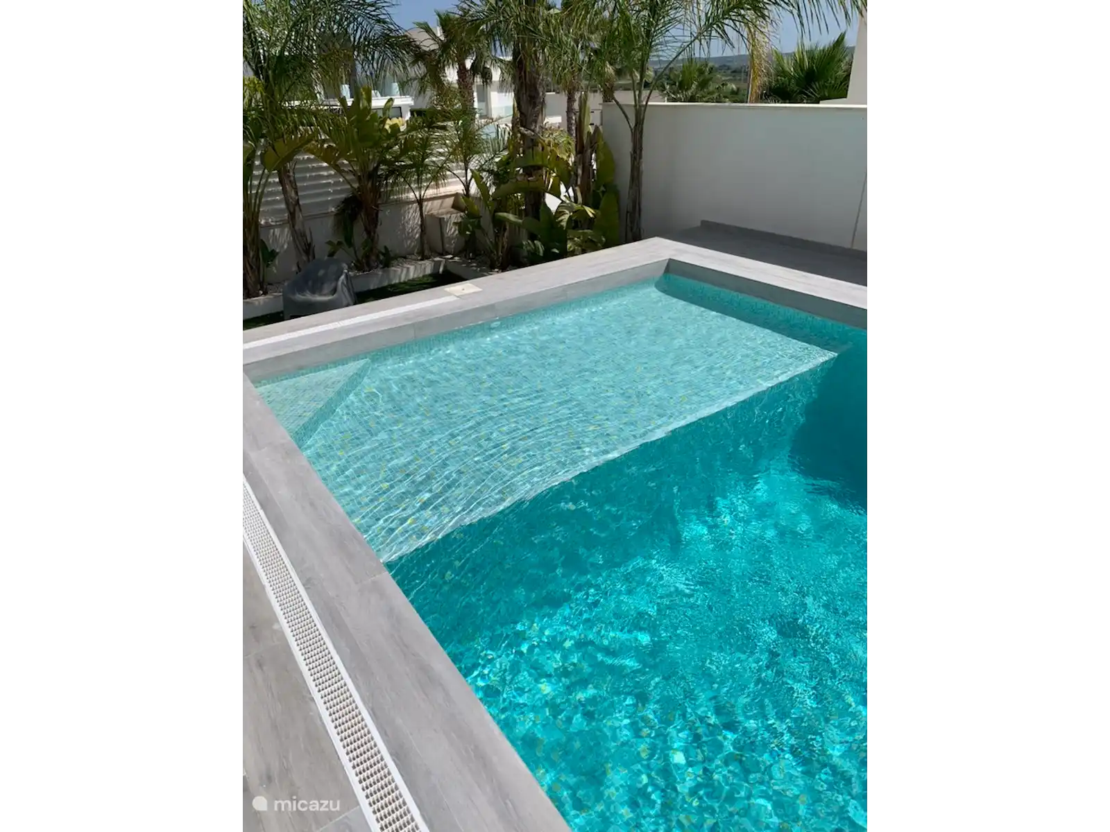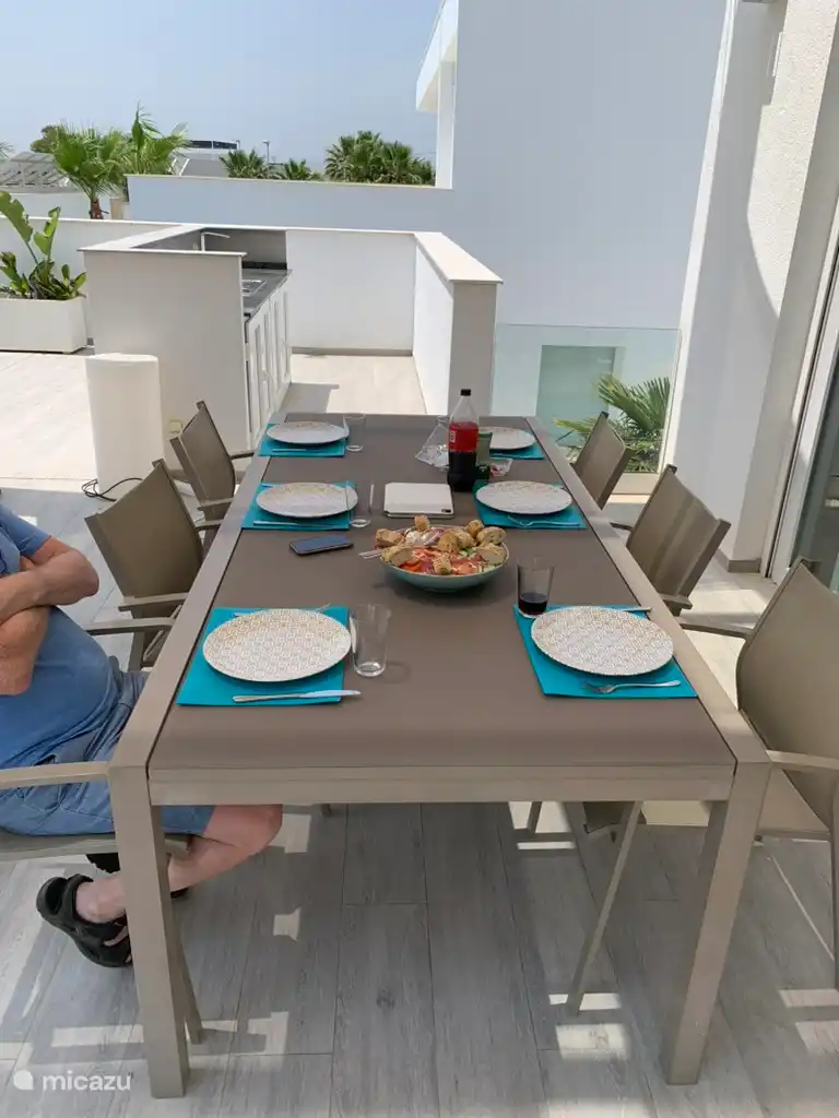 Hogar exclusivo y moderno, tanto por dentro como por fuera. Hay una gran piscina privada de 12 por 4 metros con una zona poco profunda (playa). Desde la primera planta y el solárium (segundo piso) se tiene una vista al valle de San Fulgencio.