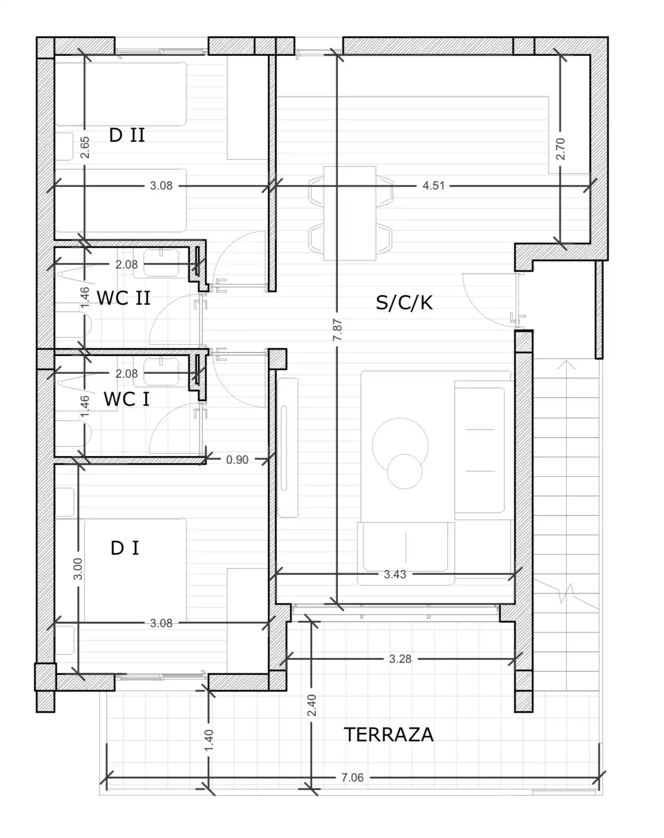 Además, el ático tiene un balcón con una mesa redonda de comedor, donde puedes sentarte cómodamente a la sombra incluso en días calurosos. Gracias a la disposición inteligente, siempre hay un lugar agradable al sol o fuera del sol.