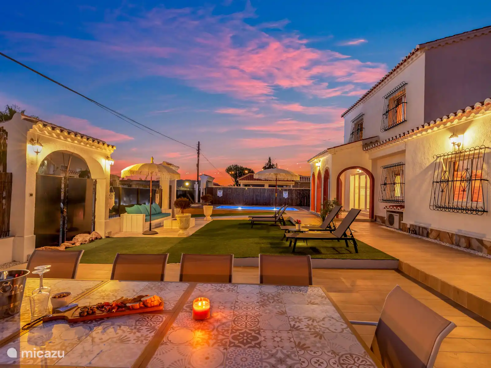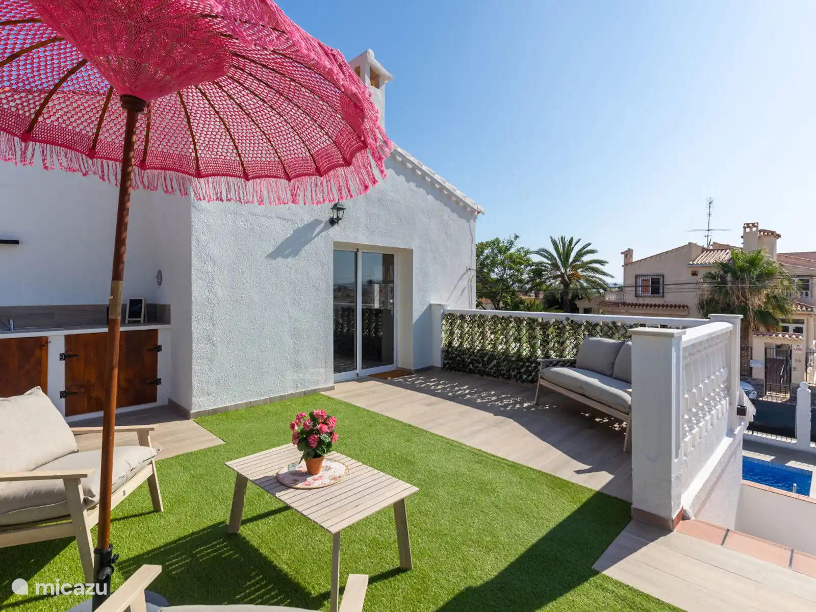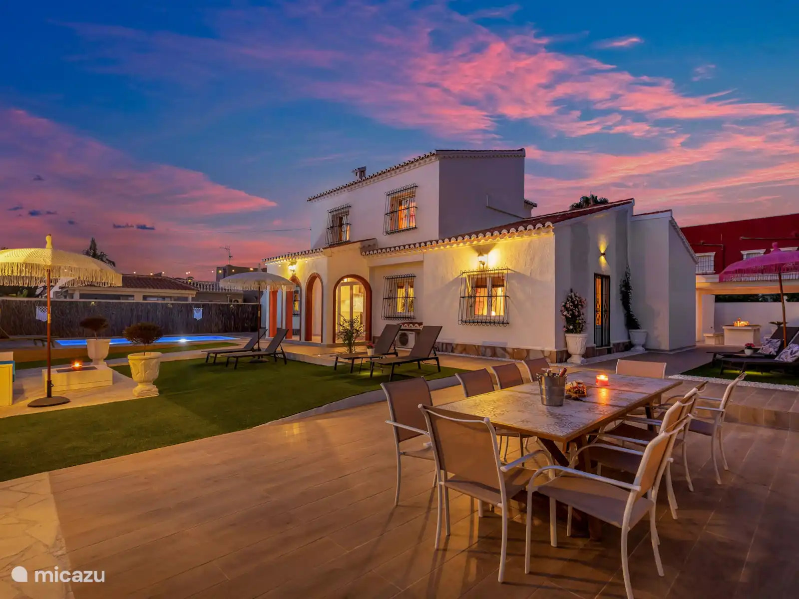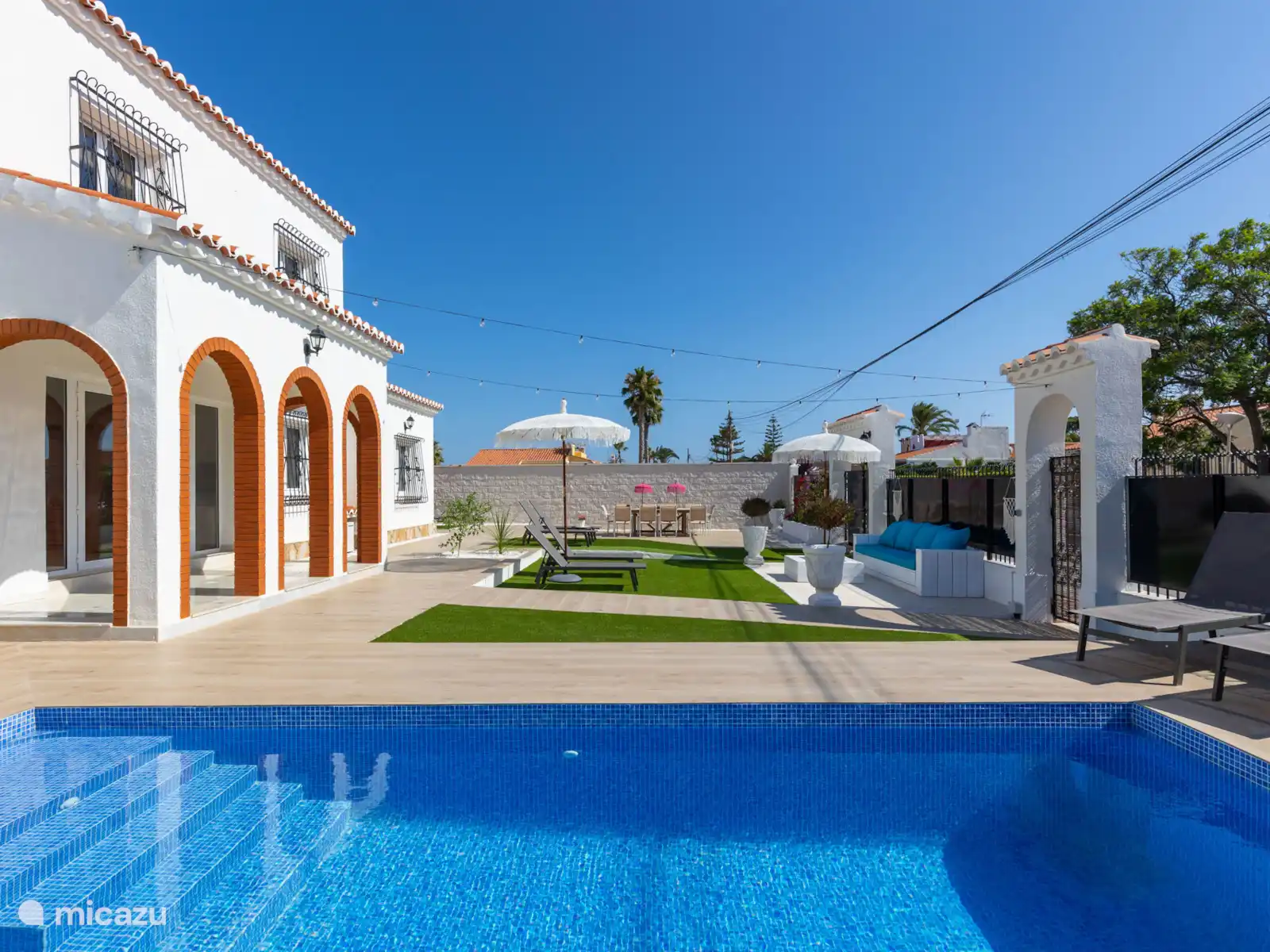 El gran jardín de Villa Mida (410 m2) es un oasis de paz y confort, con una piscina privada nueva como centro de mesa radiante. Tanto en la parte delantera como en la trasera de la casa encontrarás amplios espacios exteriores iluminados, perfectos para relajarse o disfrutar juntos. Equipado con tumbonas, zonas de descanso y dos atractivas zonas de comedor, una cocina exterior y una terraza soleada en la azotea con otra zona de barbacoa, siempre hay un lugar al sol desde temprano por la mañana hasta tarde por la noche. Ideal para largas noches de verano, barbacoas acogedoras y la sensación definitiva de vacaciones bajo el sol español.