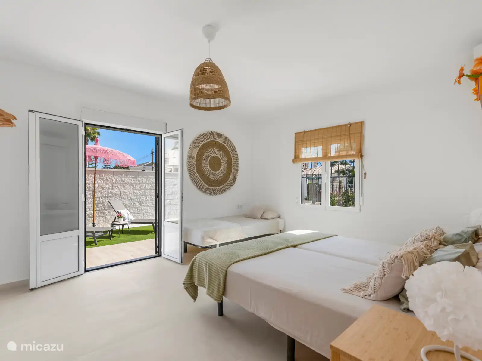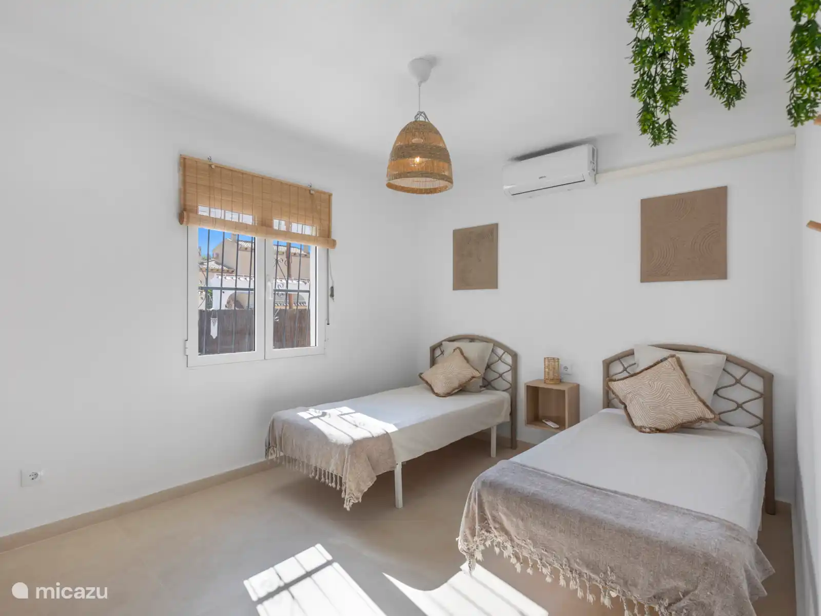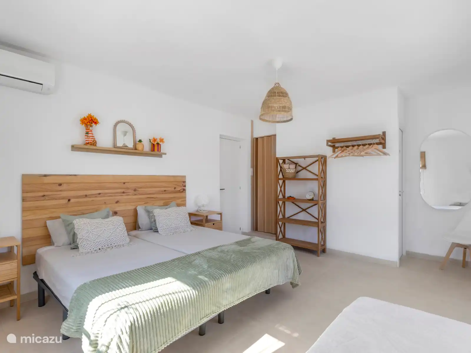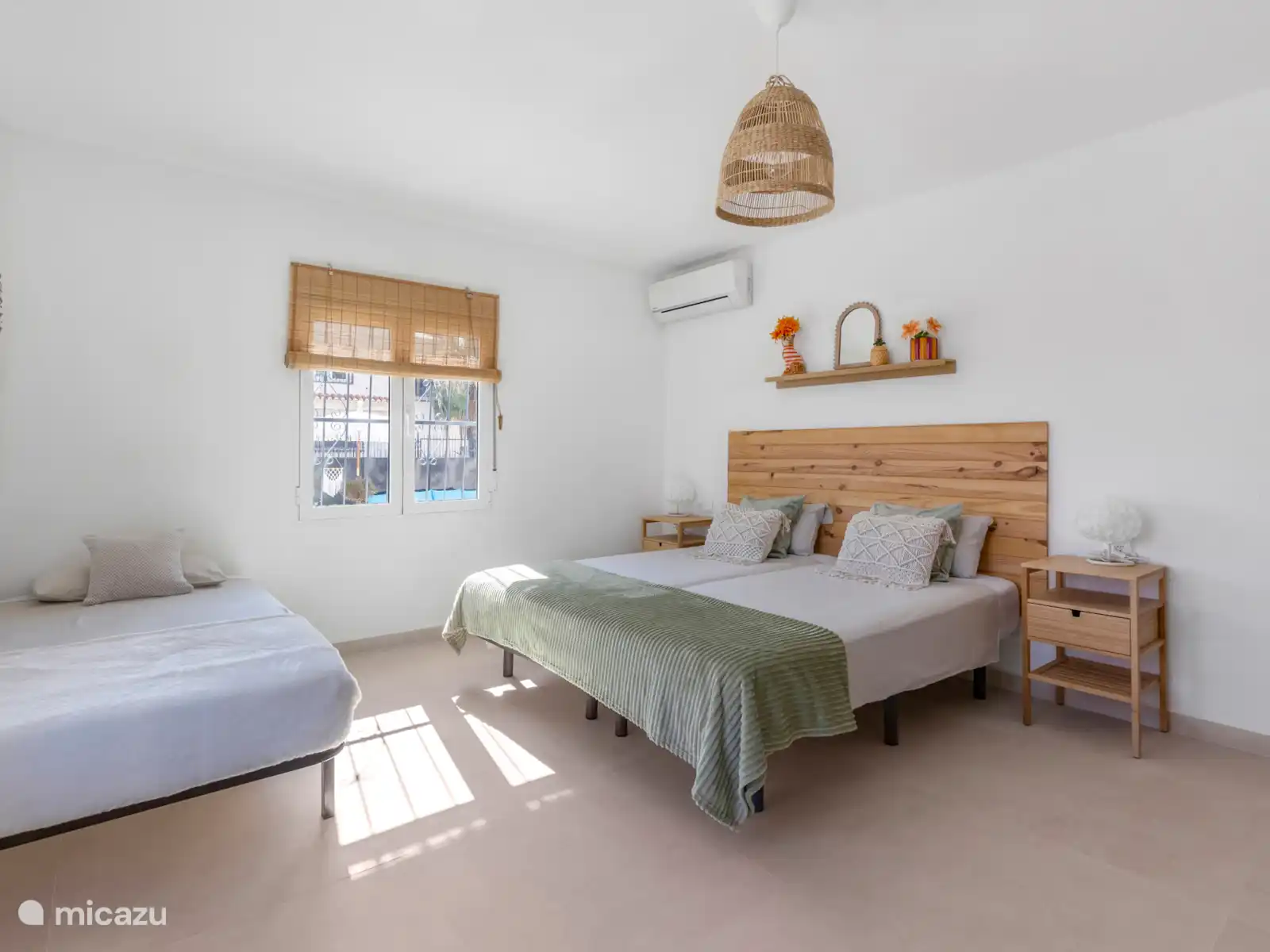 El dormitorio 3 es flexible y espacioso, equipado con una cama matrimonial con colchones independientes y una cama individual extra. Ideal para una familia o tres amigos.