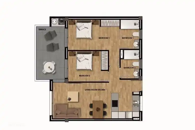 El apartamento cuenta con 2 amplios dormitorios, cada uno con 2 camas individuales (160x200cm) y 2 baños.