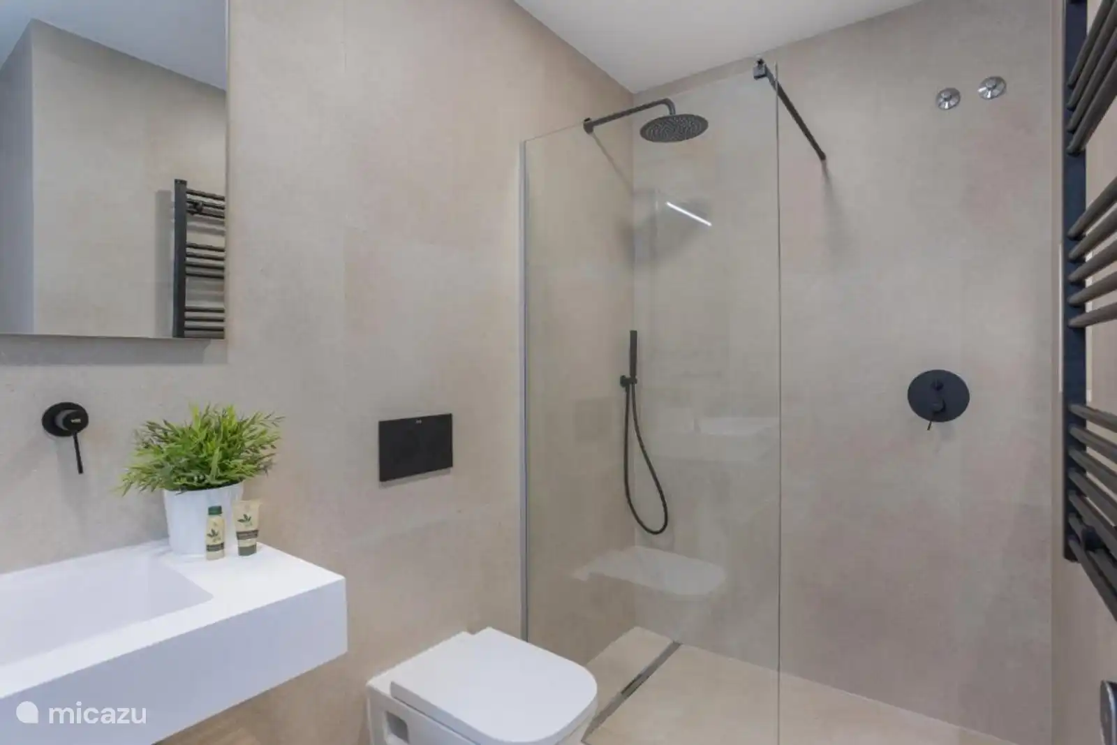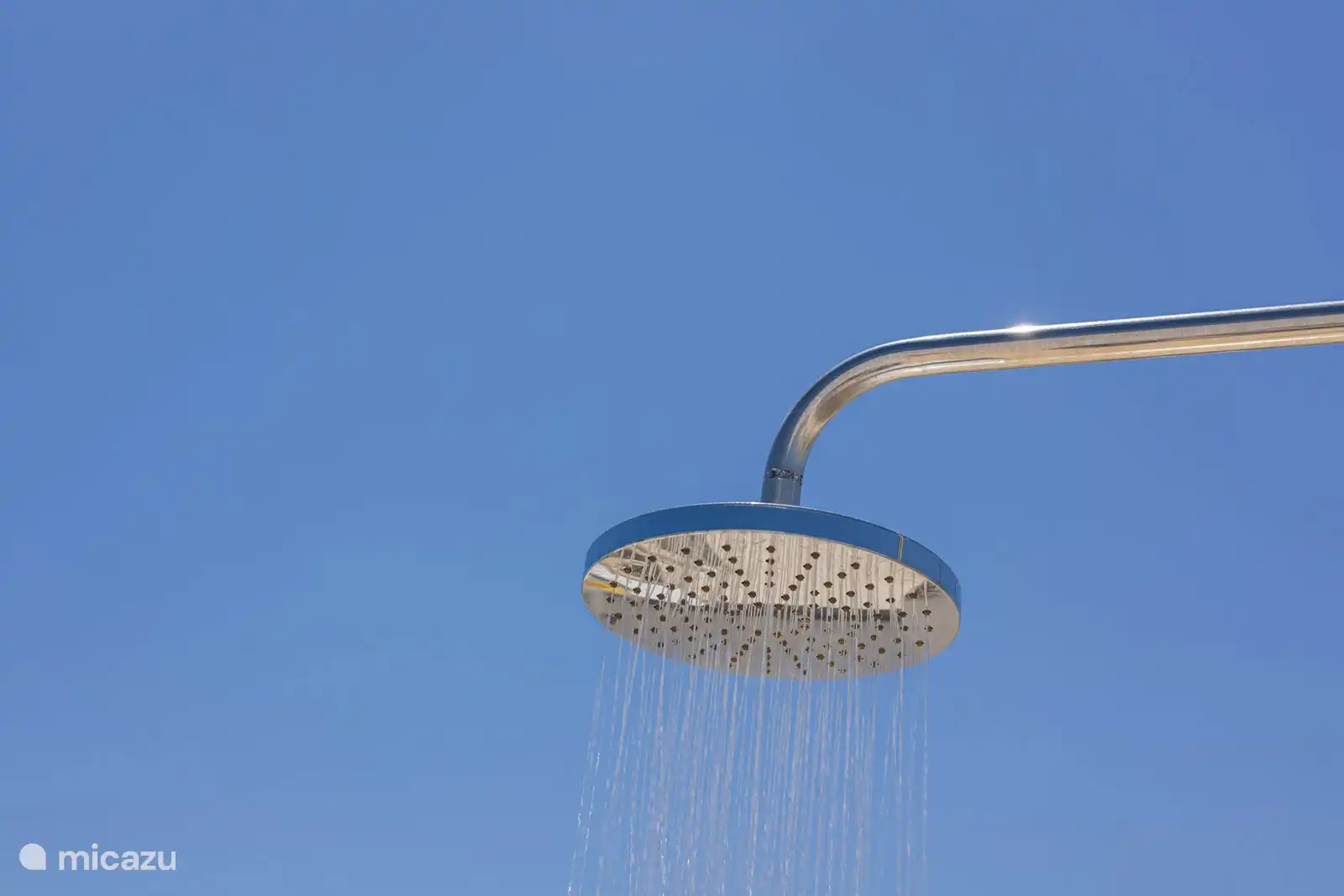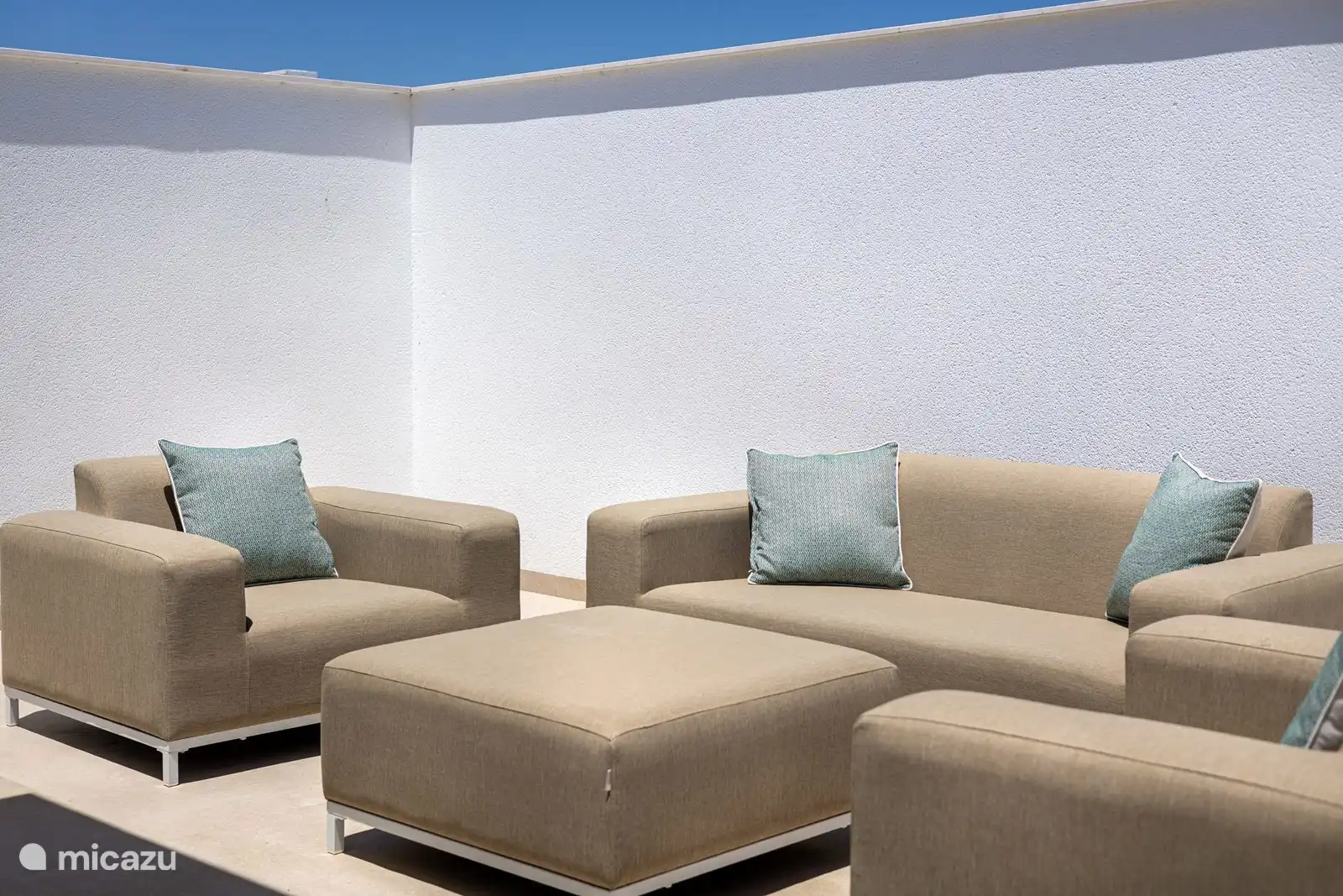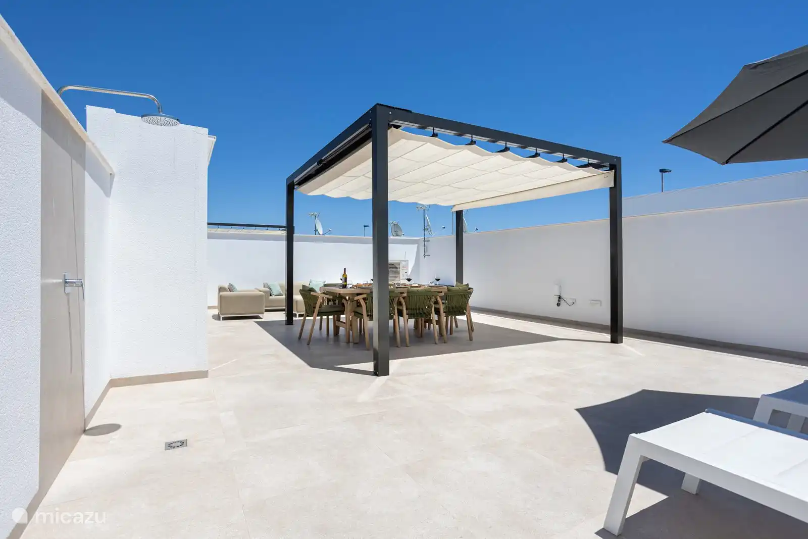 La terraza de la azotea es un oasis de relajación con un juego de salón, cómodas tumbonas, ducha al aire libre y una gran mesa de comedor. Gracias a la cocina totalmente equipada, puedes quedarte donde estás y relajarte al máximo.