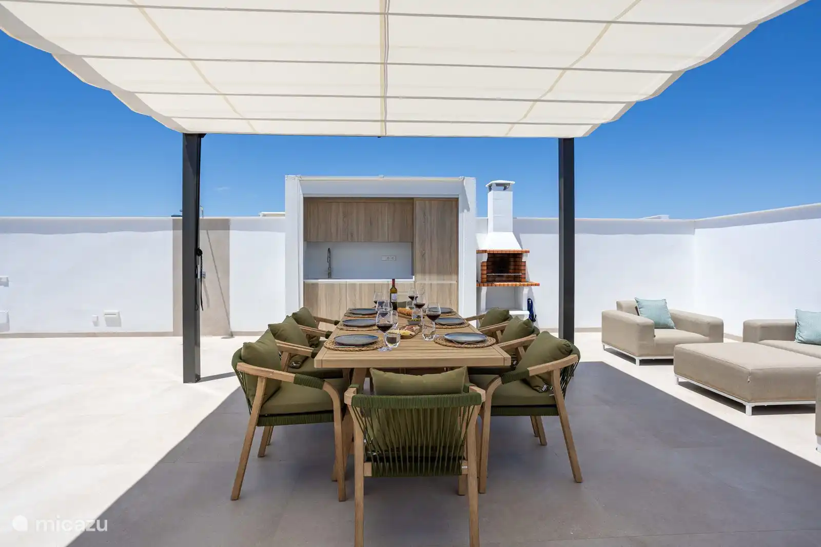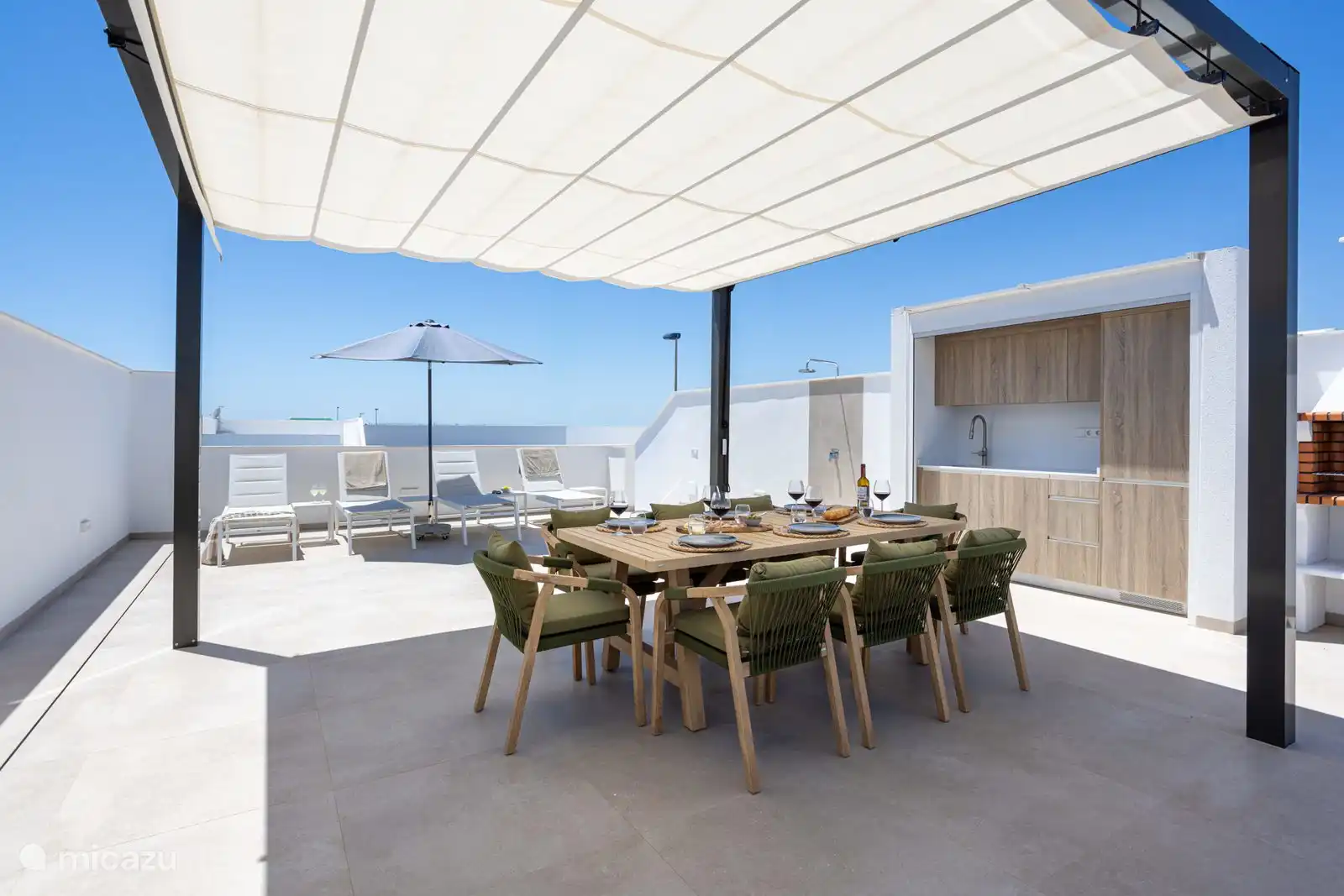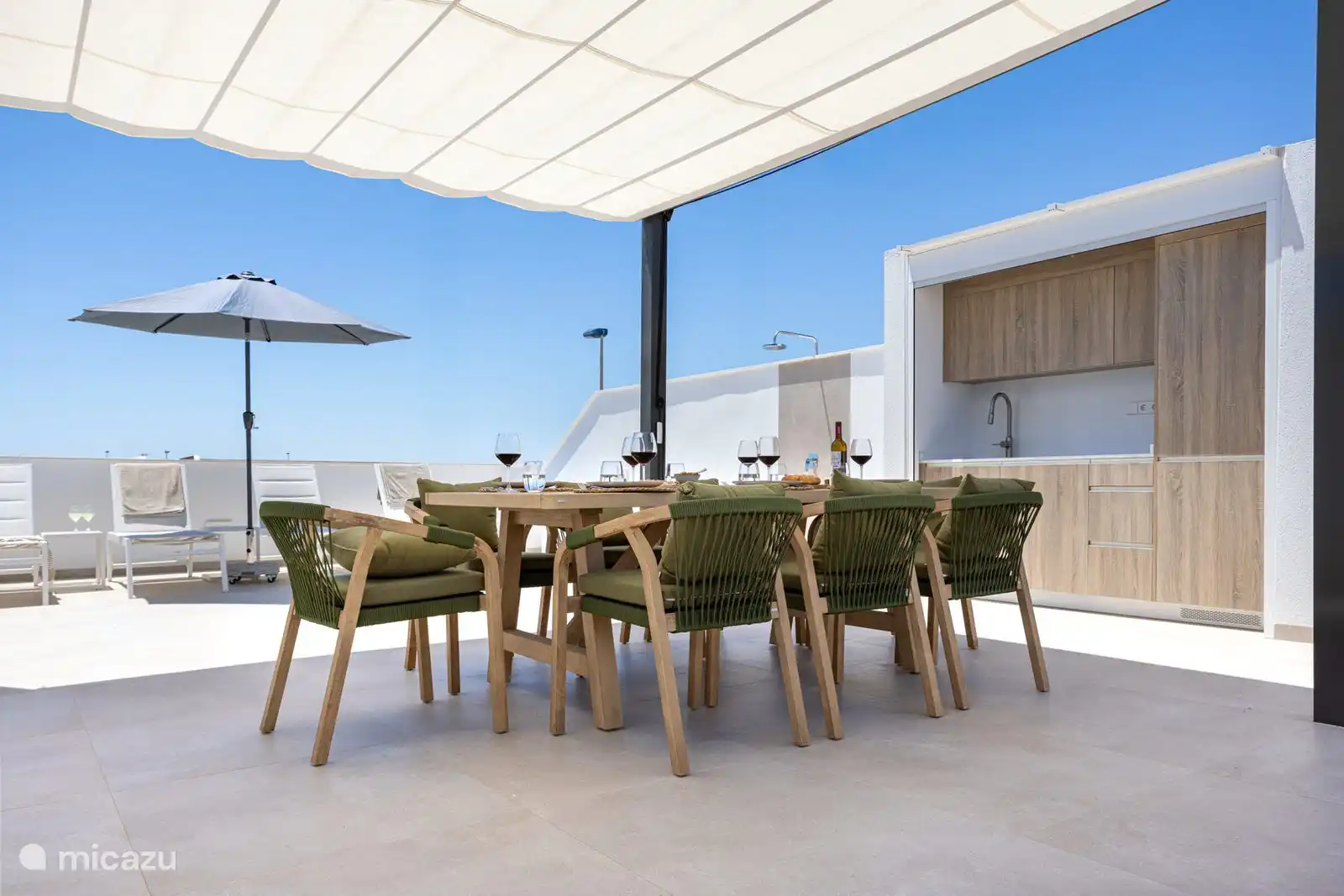 Aprovecha al máximo la terraza de la azotea y toma el sol con una bebida fría de la nevera. La cocina exterior totalmente equipada con nevera, congelador, lavavajillas, vasos, platos y cubiertos le permite disfrutar aún más de la vida española.