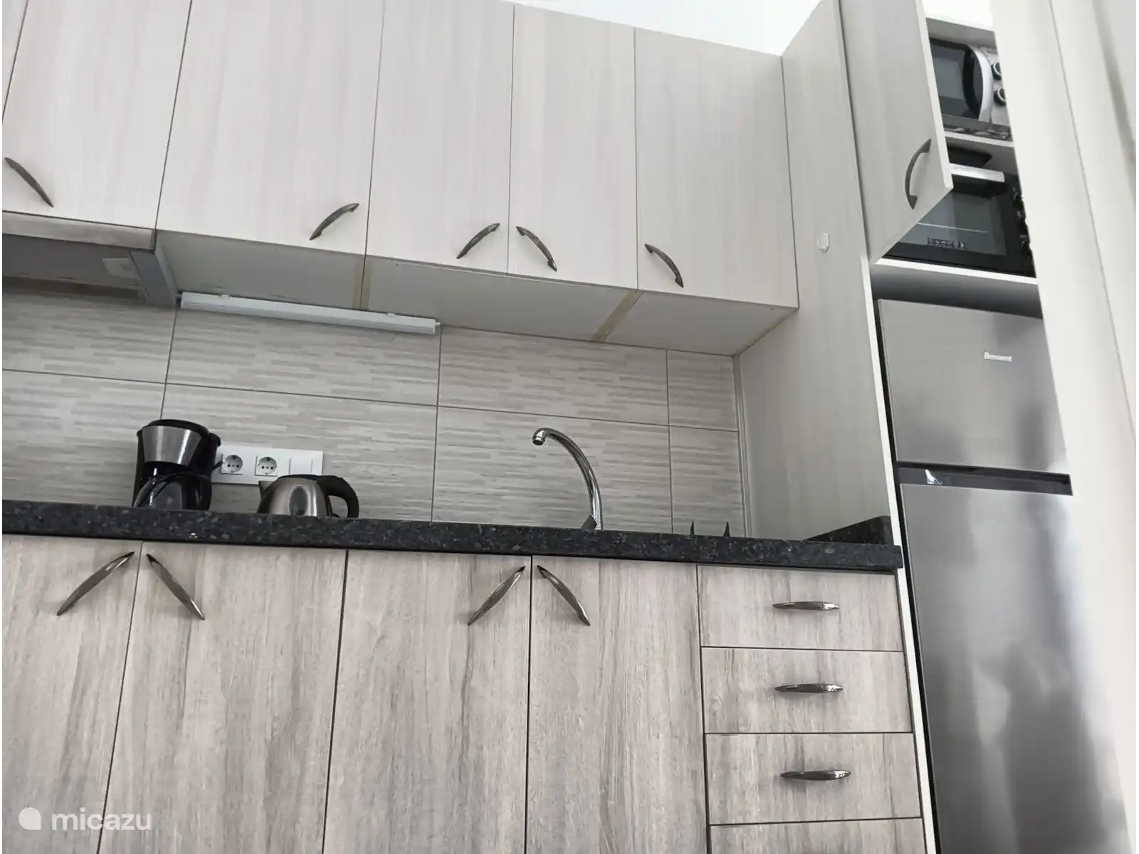 Hay cafetera, tetera, batidora, batidora de mano, barbacoa y una cafetera. En los armarios encontrarás muchas sartenes, platos, tazas, vasos y cubiertos. También hay una cocina extra en el armario.