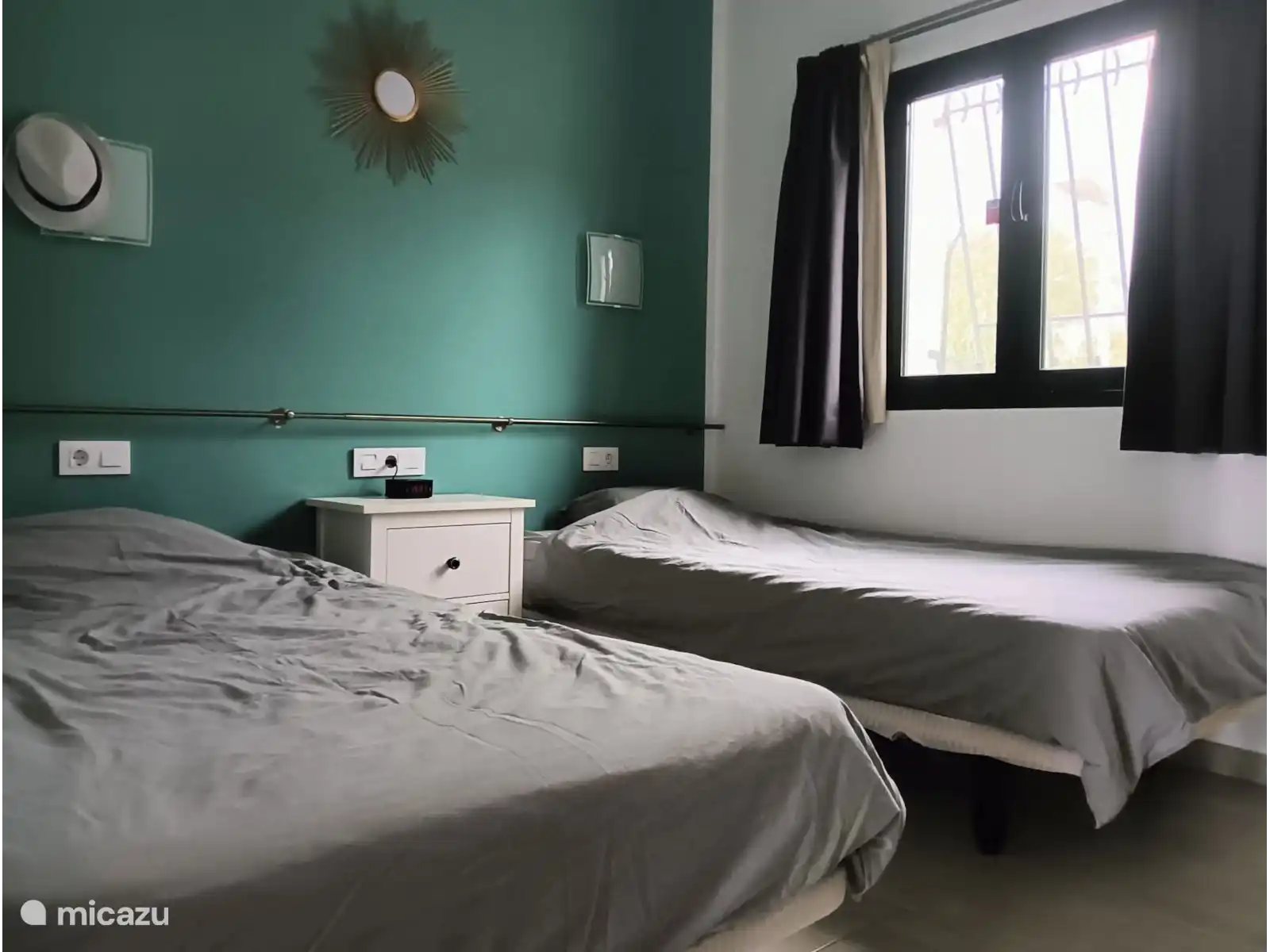 Este está equipado con 2 grandes camas individuales (que se pueden juntar), una mesita de noche, armario, un despertador y una caja fuerte.