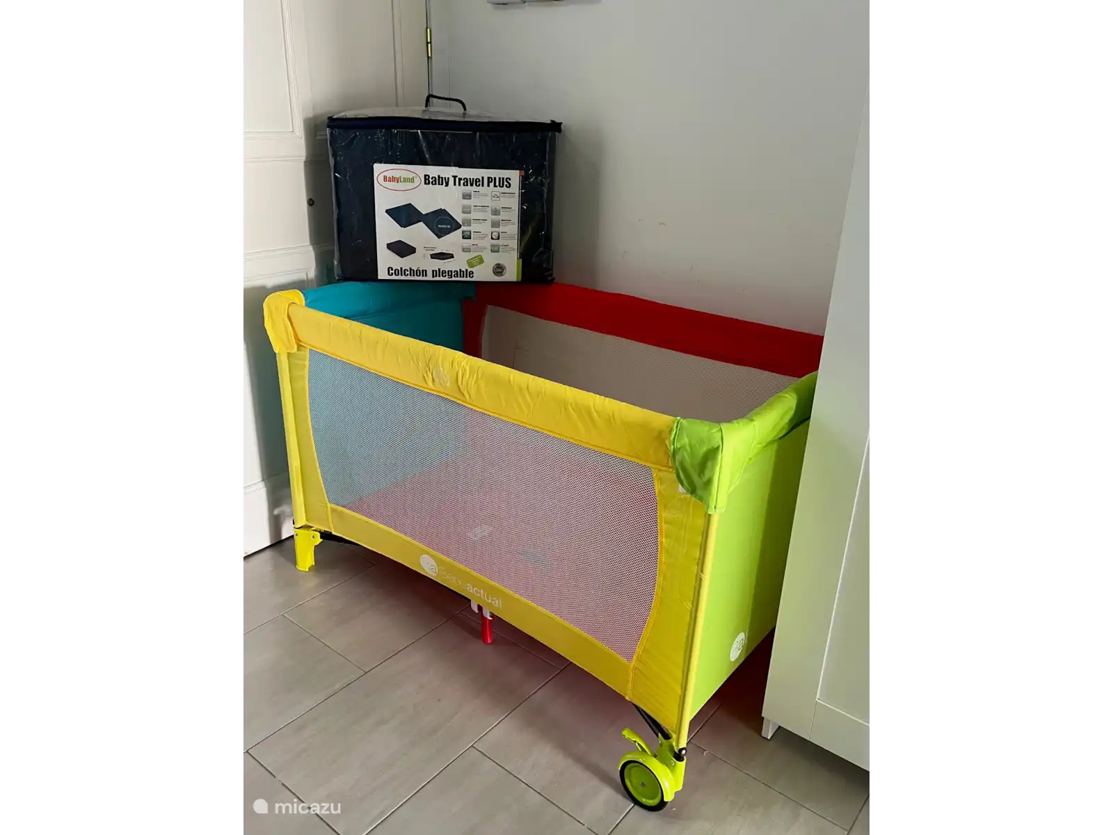 (Aquí hay tabla de planchar, plancha y escurridero, pero también una cama de camping)