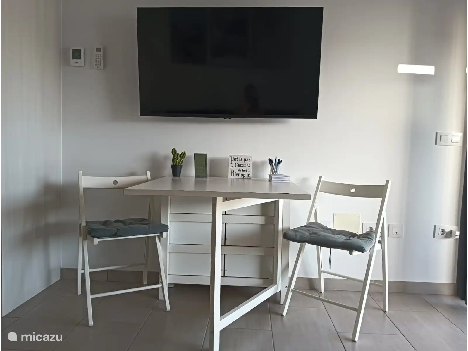 El salón tiene un sofá espacioso (para dormir) y una mesa de comedor con 2 sillas, y está climatizado.