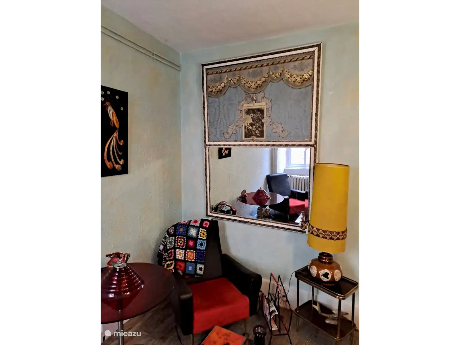 Habitación independiente con mesa de comedor, sillas y 2 asientos, amueblada de época y con cafetera, microondas y, por supuesto, cubiertos, platos, etc.