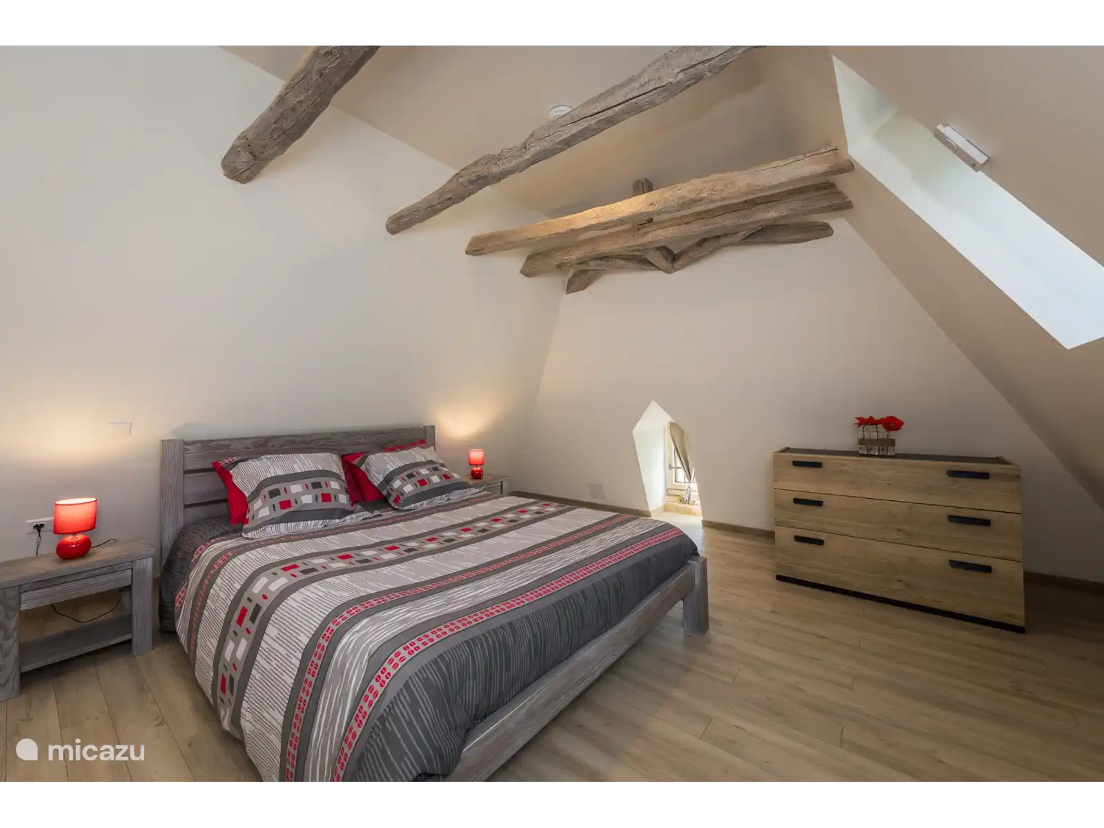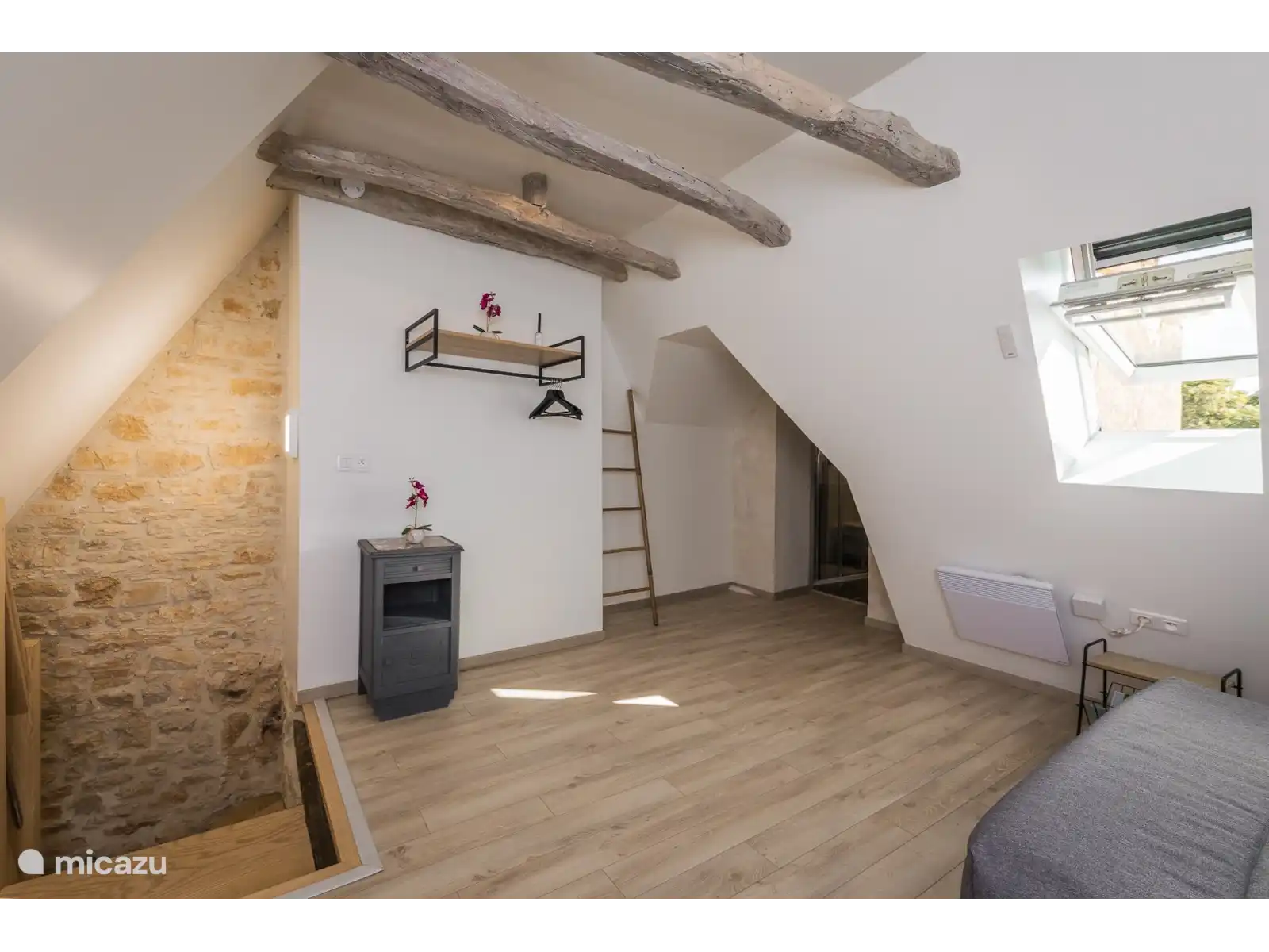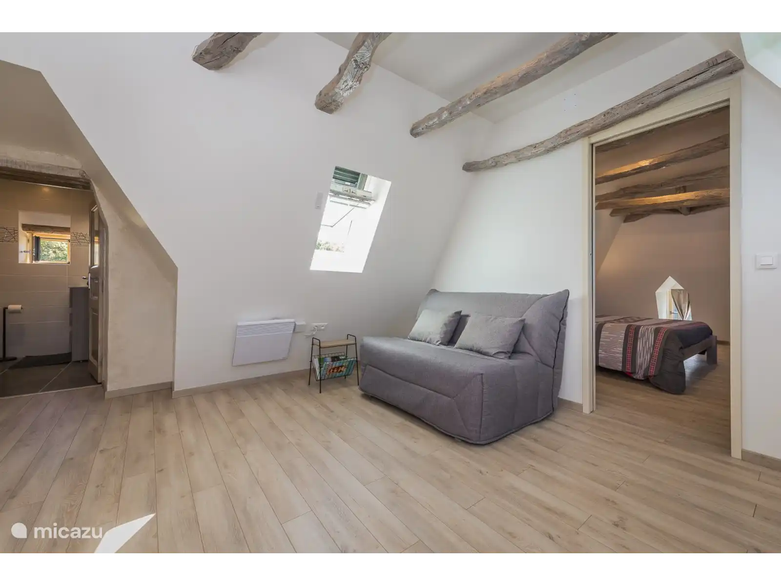 La escalera de madera conduce a la planta superior con un tercer dormitorio doble espacioso, un descansillo con sofá cama y espacio para una camilla de viaje, y un segundo baño moderno.