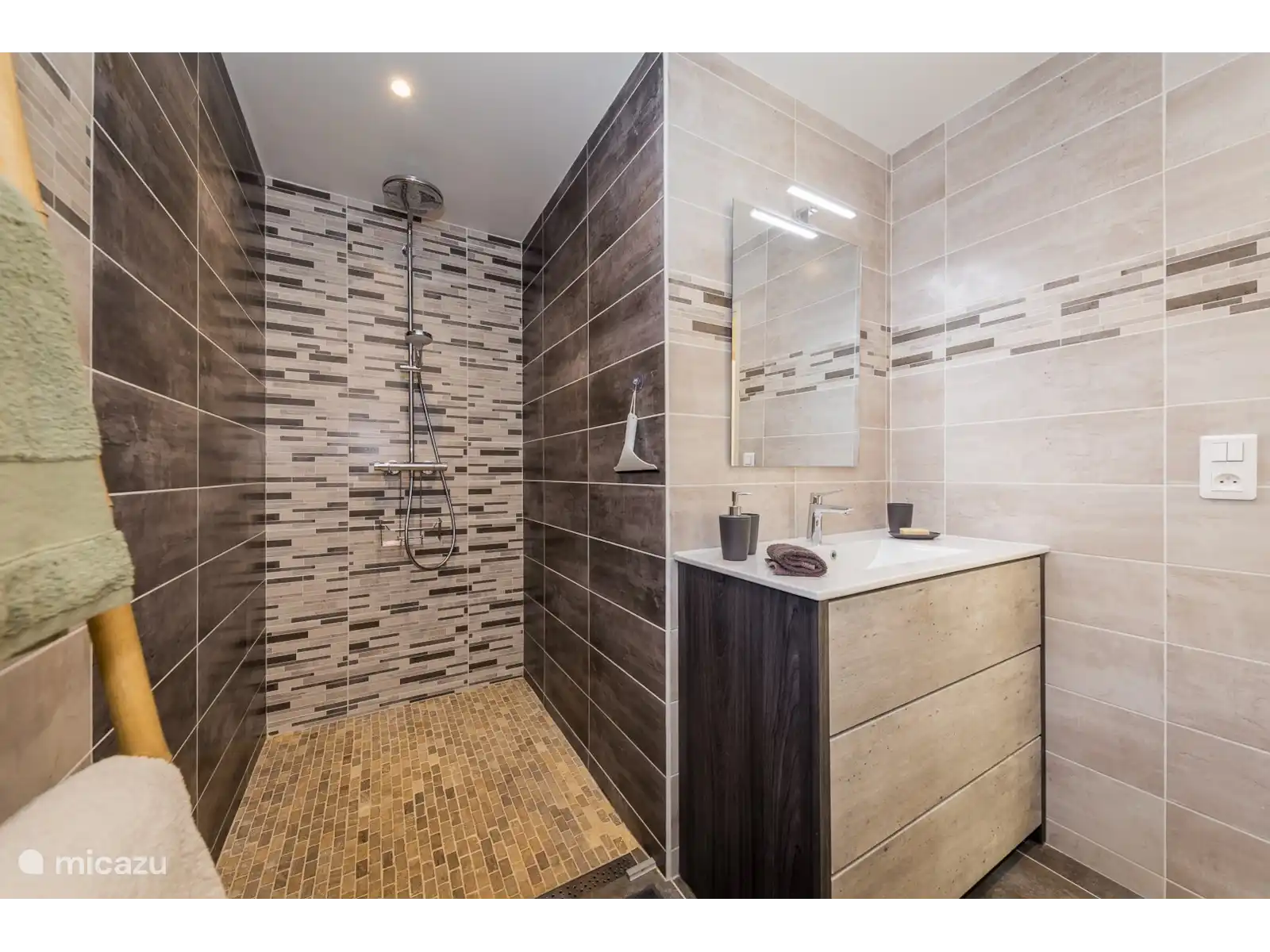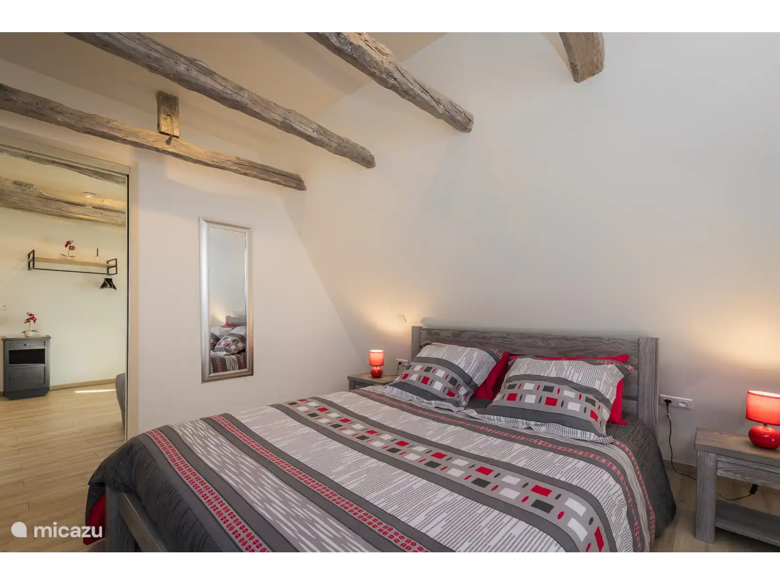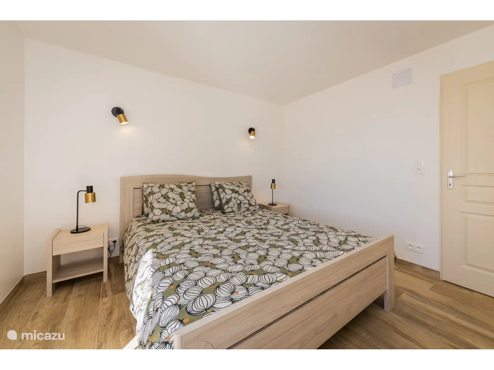 La escalera de madera conduce a la planta superior con un tercer dormitorio doble espacioso, un descansillo con sofá cama y espacio para una camilla de viaje, y un segundo baño moderno.