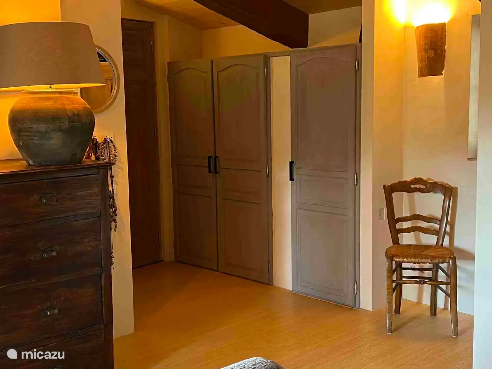 El primer dormitorio con elementos ocres tiene un lecho de somier de 160x200 y acceso directo a una pequeña terraza con vistas al valle de Cotignac.