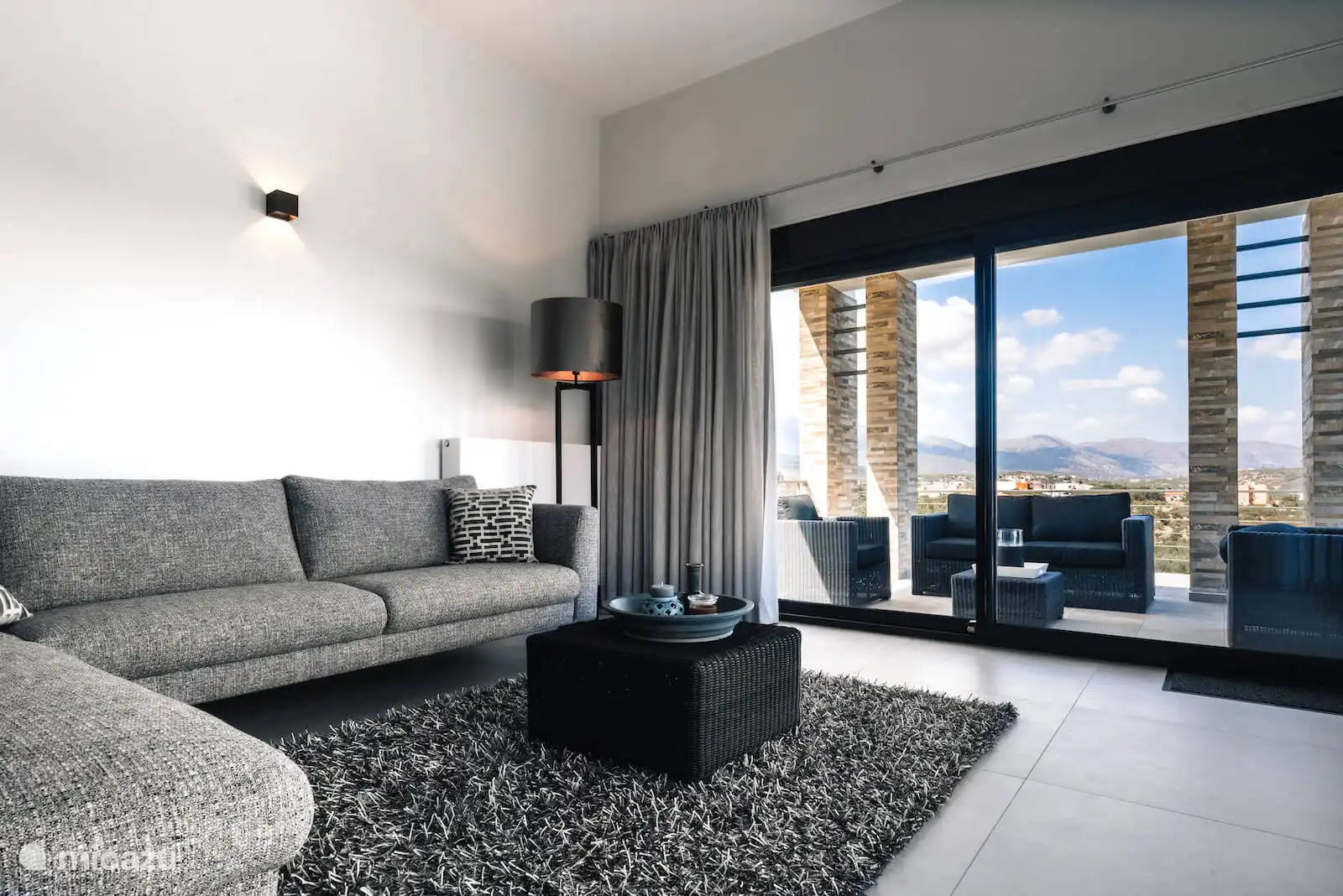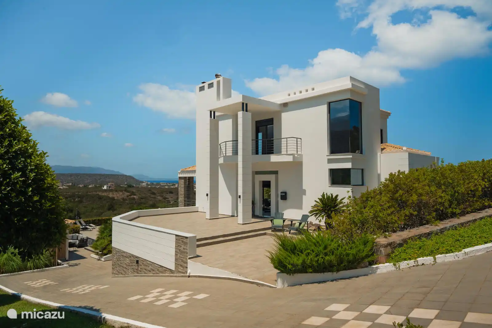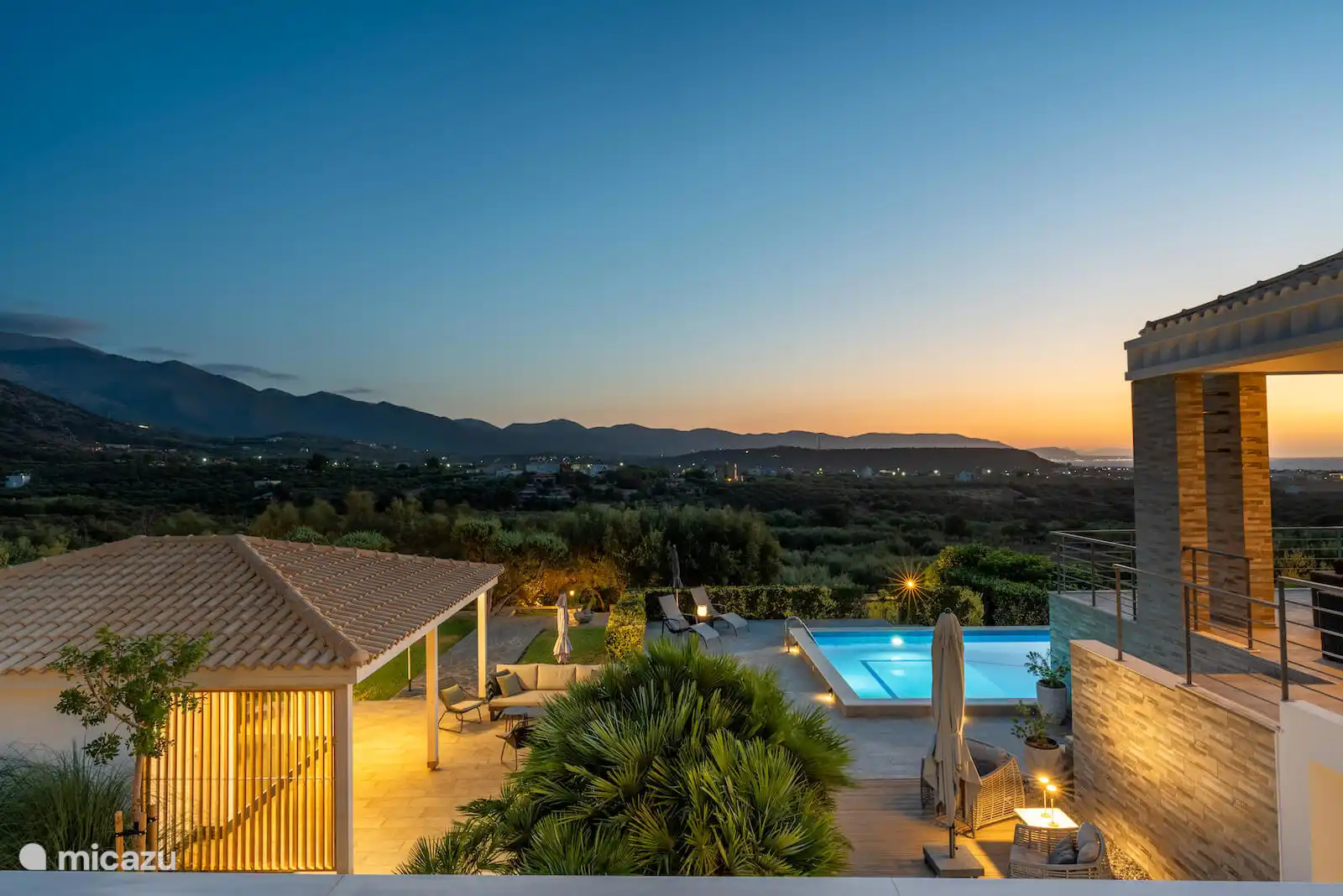 Sal al exterior para disfrutar de la piscina privada de la villa, rodeada de tumbonas y de un bar exterior totalmente equipado, perfecto para disfrutar de cócteles, cenas informales o recibir invitados con estilo. Desde la terraza, se pueden disfrutar de impresionantes vistas al mar, mientras que las zonas ajardinadas ofrecen un entorno tranquilo para relajarse y disfrutar del sol cretense.