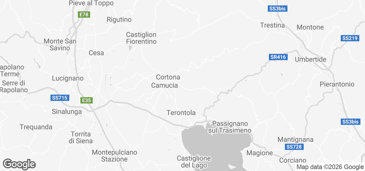 Cortona (centro histórico) a 9 km, el lago Trasimeno a 20 km, Arezzo a 33 km, Montepulciano a 33 km, Montalcino a 68 km, Perugia a 48 km, Siena a 77 km, Pienza a 51 km, Florencia a 118 km, Roma a 210 km.