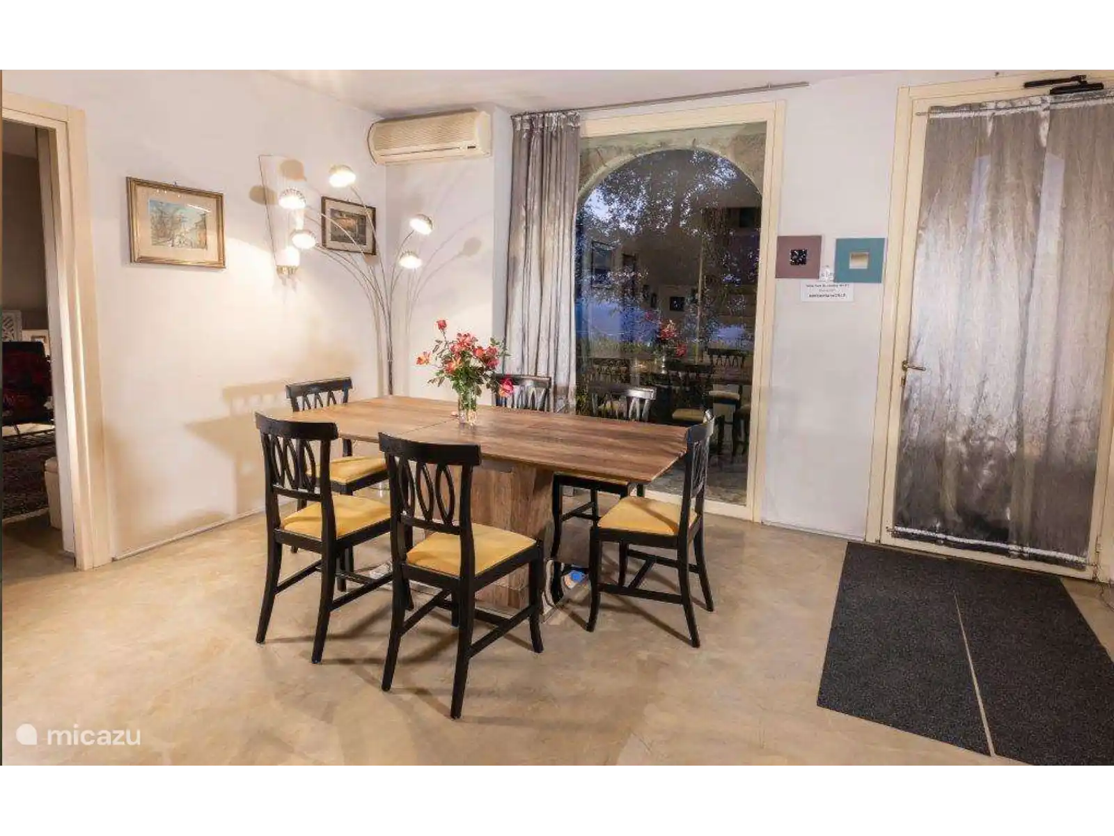 Salón con mesa de comedor (14 personas), dos sofás, dos sillones, escritorio, wifi, aire acondicionado y acceso al jardín.