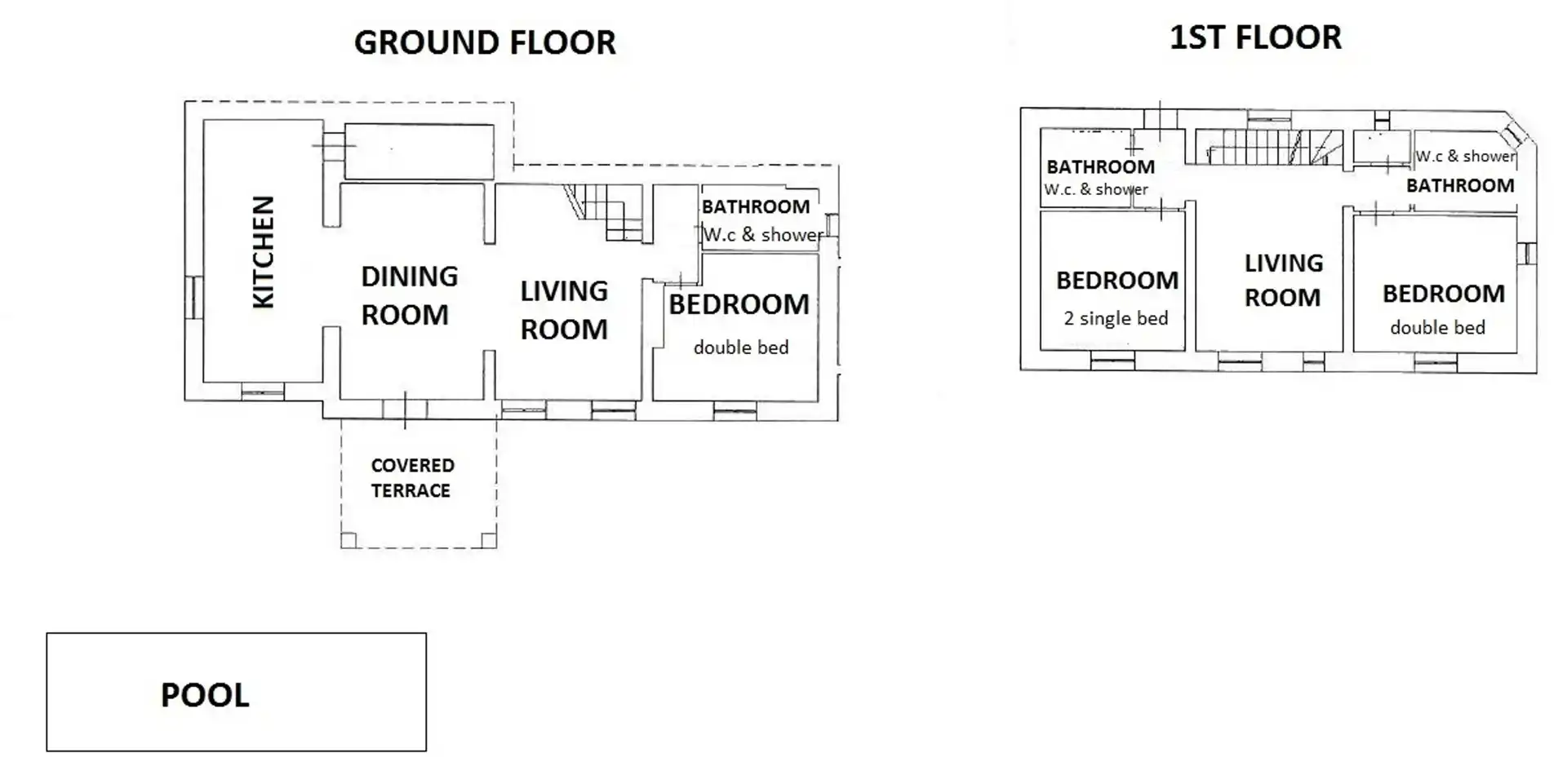 1ª planta: salón, 2 dormitorios con aire acondicionado, 2 baños.