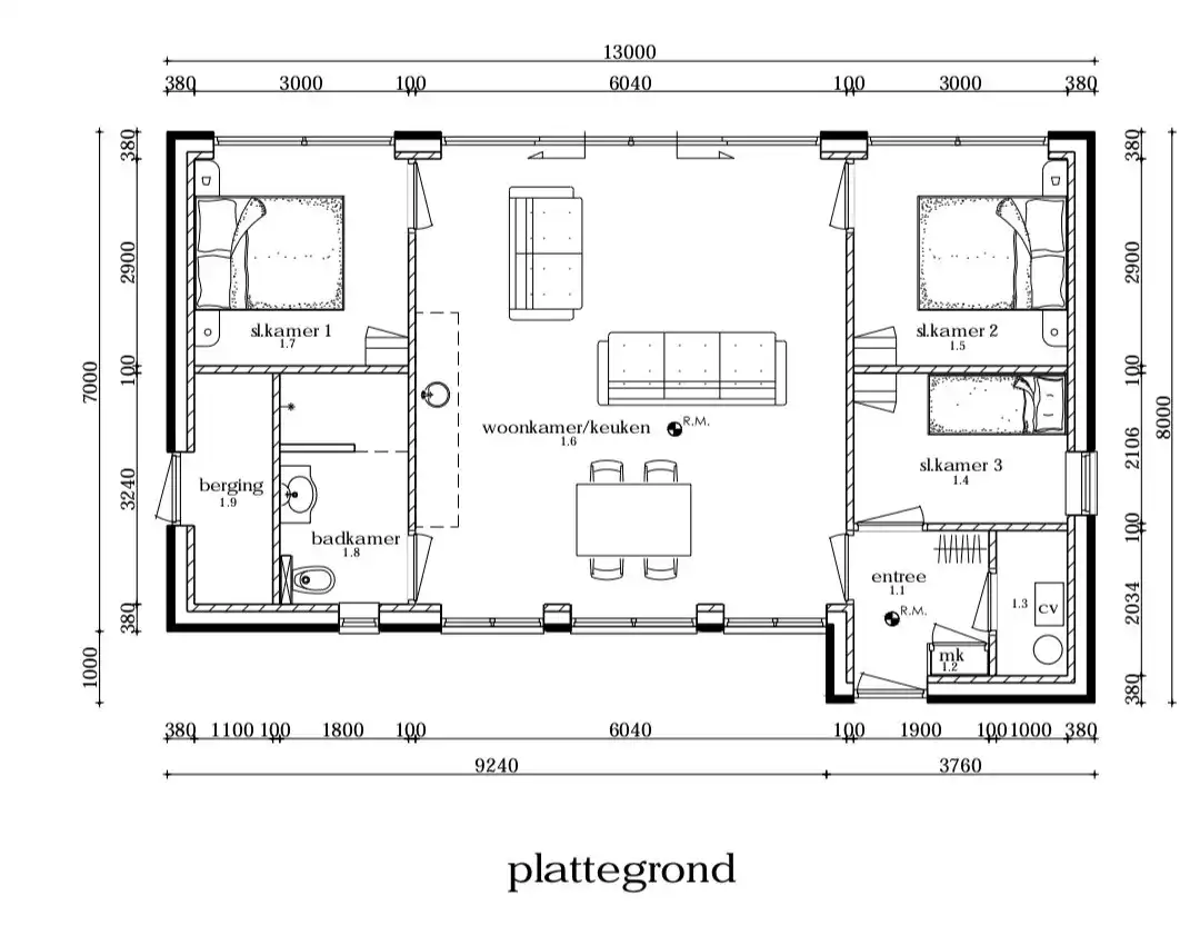 El bungalow tiene 3 dormitorios, 2 con camas dobles y 1 con litera. Todas estas habitaciones tienen aire acondicionado. El lujoso baño tiene ducha de lluvia, lavabo e inodoro. La cocina moderna tiene un combimagetron, lavavajillas y una placa de inducción. También hay una cafetera Nespresso, hervidor de agua y tostadora. La lavadora y la secadora se encuentran en el trastero (exterior).