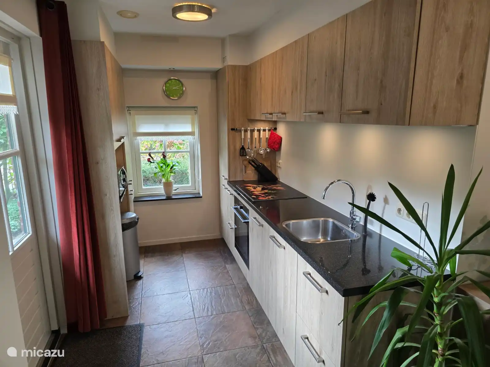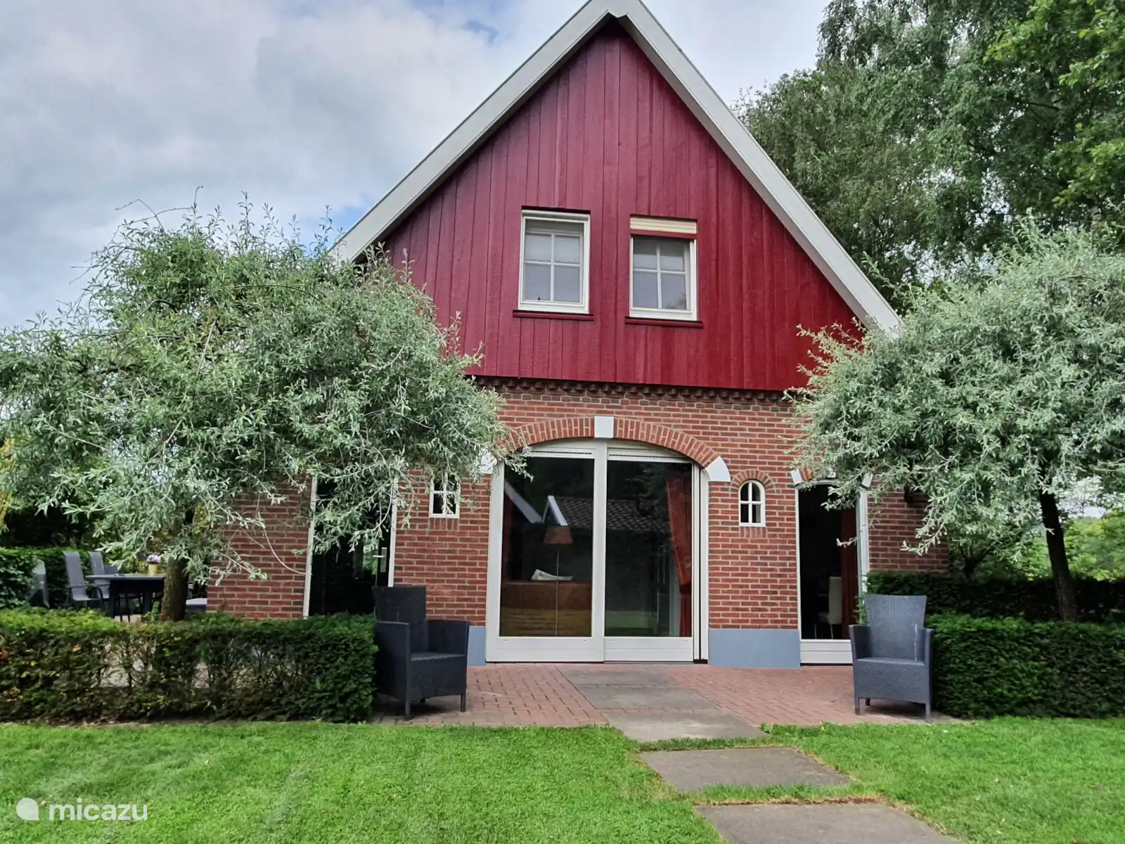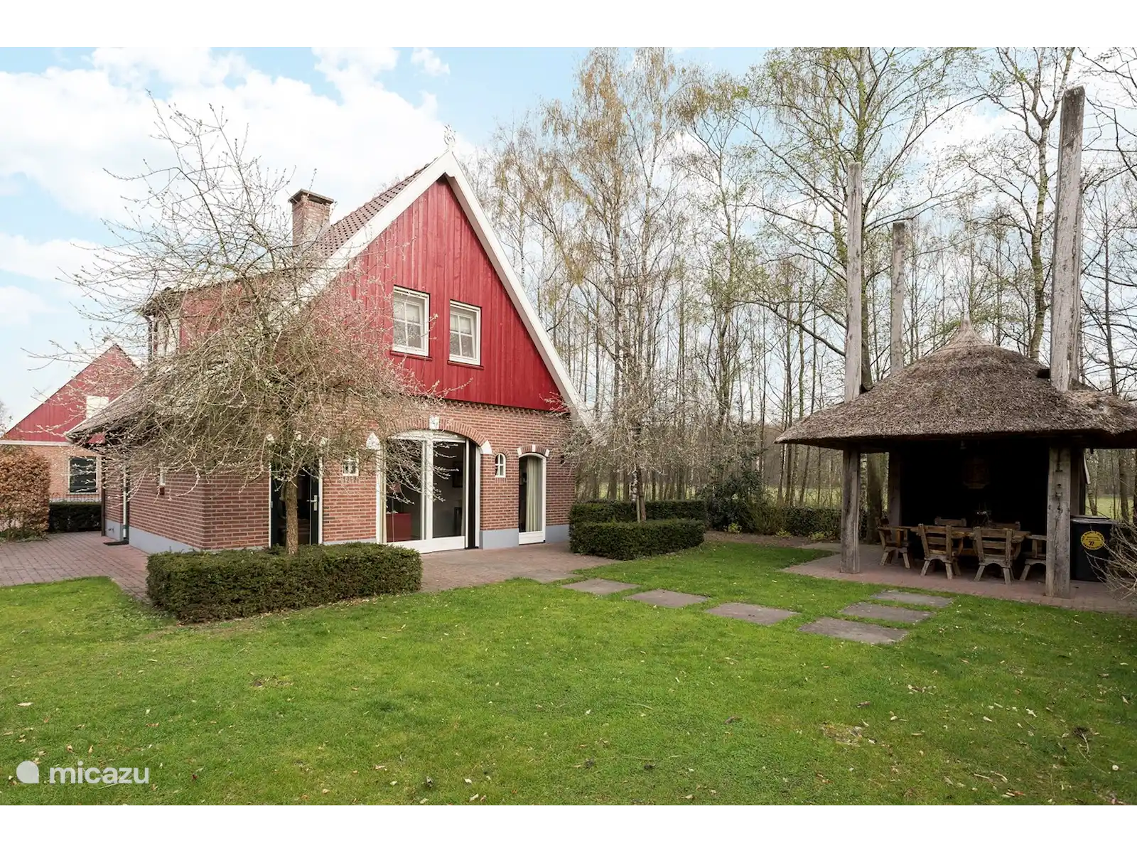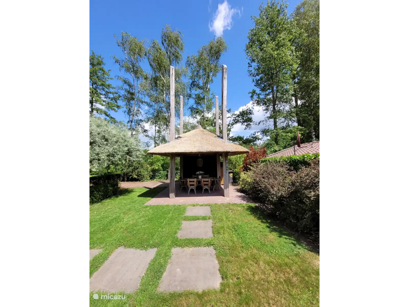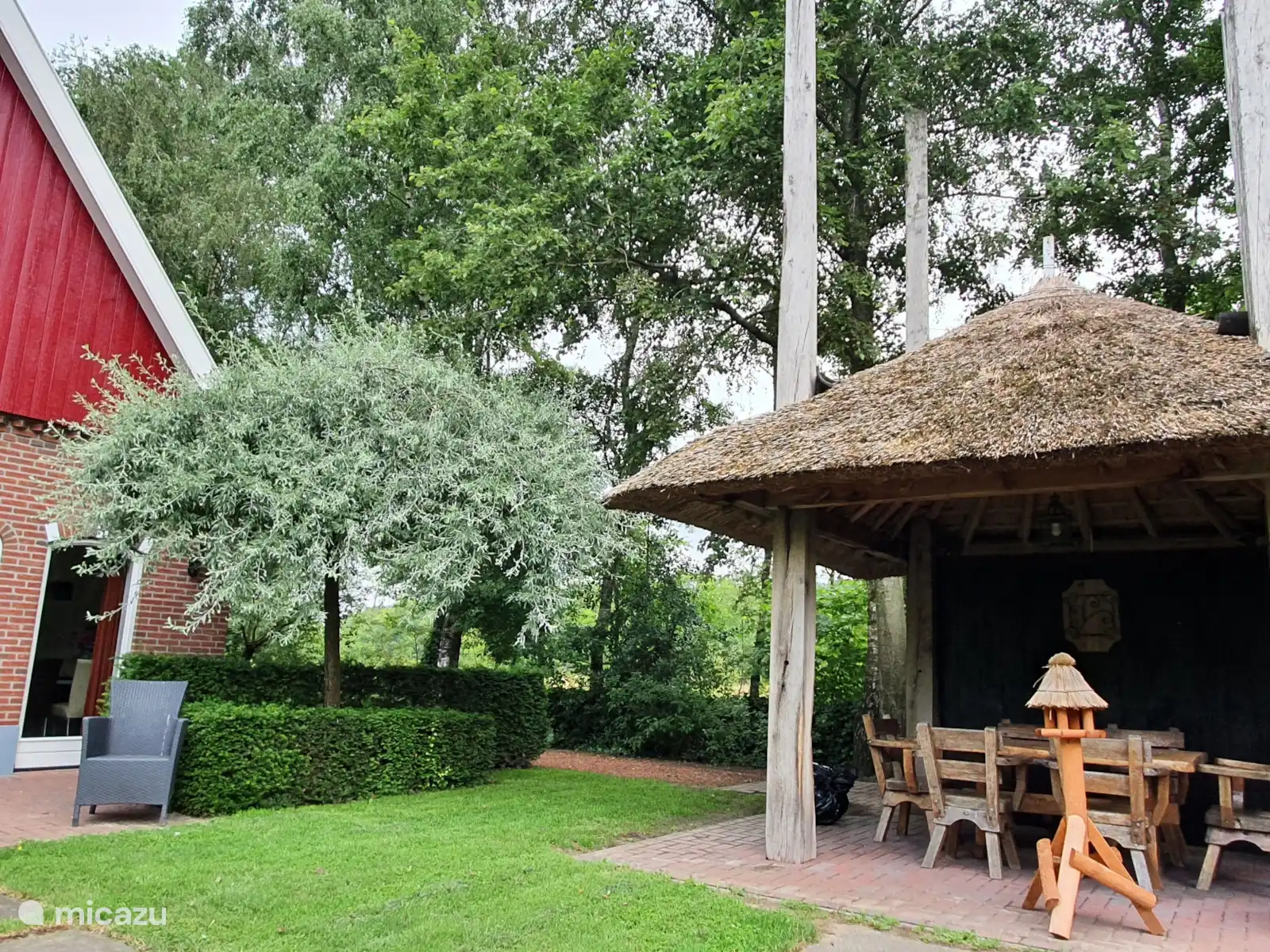 El gran jardín tiene varias áreas para sentarse que incluyen un pajar como barbacoa en la terraza cubierta y 2 espacios de estacionamiento para varios autos, el jardín vallado tiene un tamaño aproximado de 1000 m-2 y está completamente vallado para que pueda disfrutar de paz, espacio y privacidad. Finalmente, hay un cobertizo para bicicletas. En la escuela de equitación cercana tiene la posibilidad de estabular a su caballo.