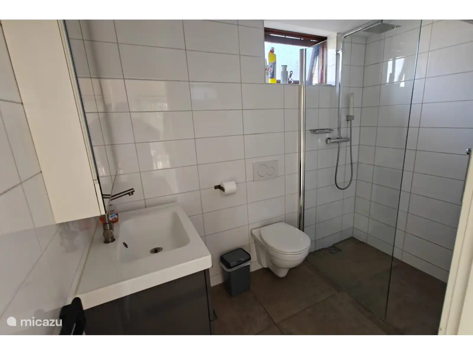 El baño moderno está elegantemente acabado y equipado con una amplia ducha a nivel de vestido, inodoro y lavabo. Un espacio fresco y cómodo donde puedas empezar o terminar el día relajado.