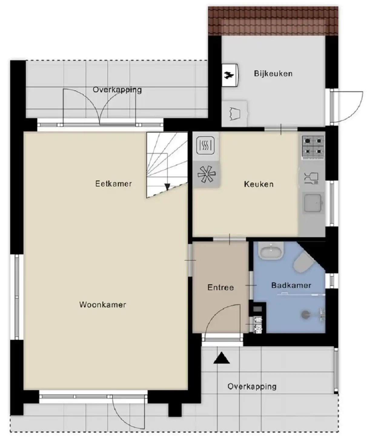 En la planta baja hay una sala de estar con suelo de baldosas con calefacción por suelo radiante, puertas de patio y una escalera abierta a la 1ª planta, un baño con calefacción por suelo radiante, una cocina y un lavadero. La cocina está equipada con una placa de gas de 4 fuegos, campana extractora, lavavajillas, nevera-congelador y horno combinado/microondas. El baño tiene ducha, inodoro y lavabo.