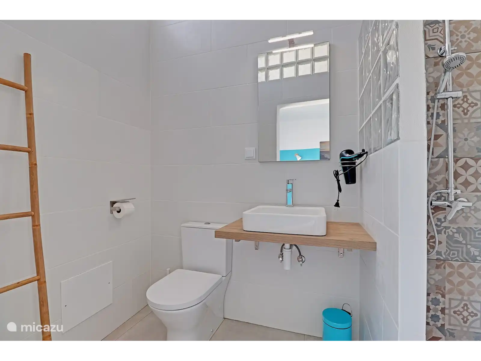 El baño consta de ducha de lluvia, inodoro y lavabo.