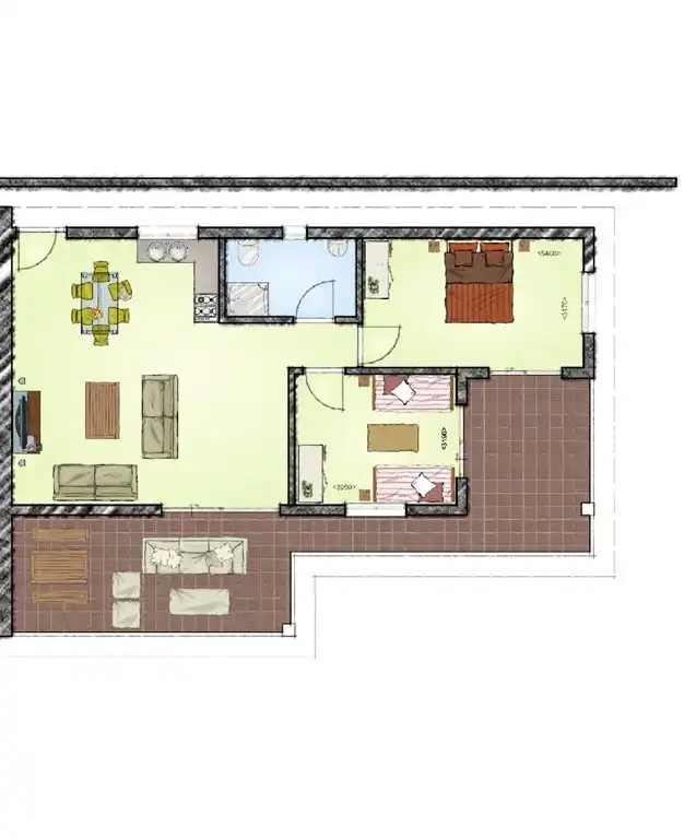 Un gran porche sombreado de aproximadamente 25 m² con cocina exterior, barbacoa y todo el mobiliario necesario para la restauración al aire libre. También hay un salón y una terraza solárical, con dos tumbonas y una sombrilla.
