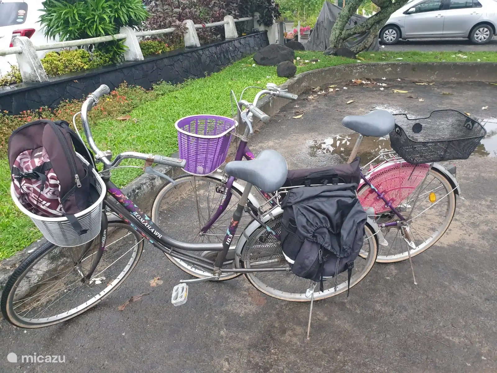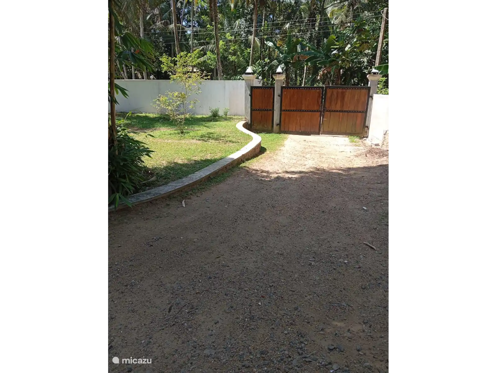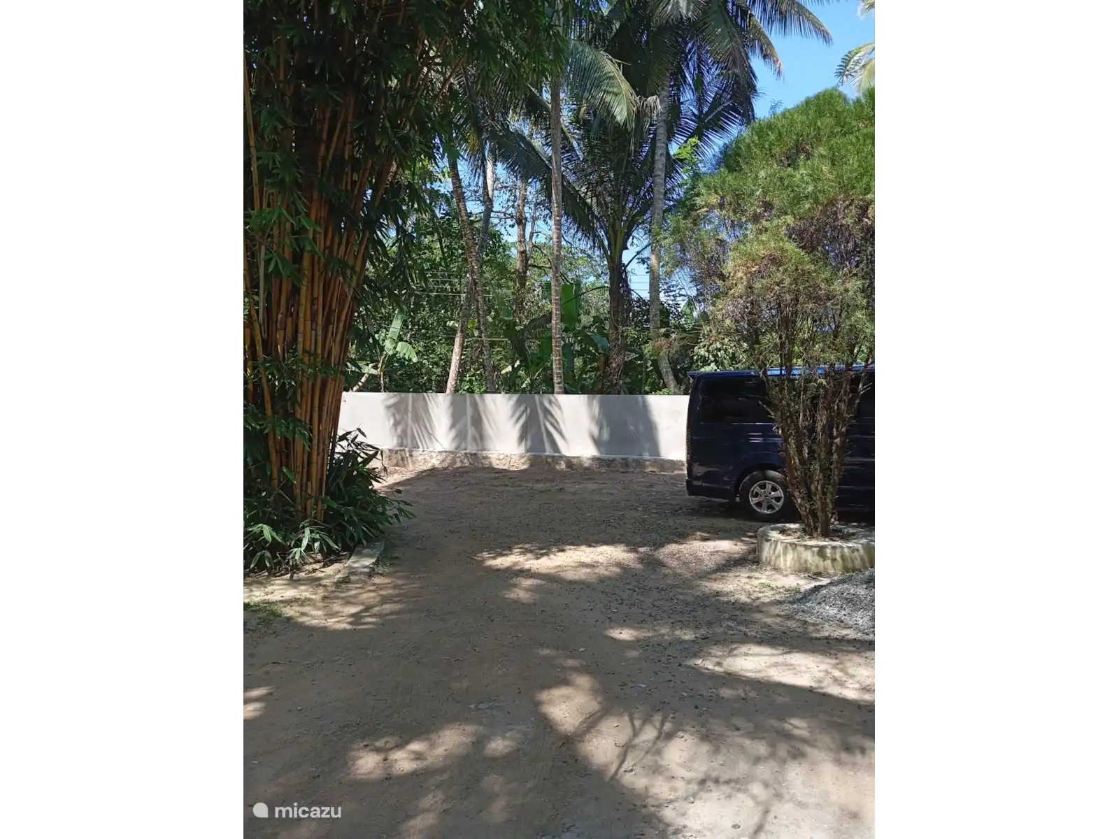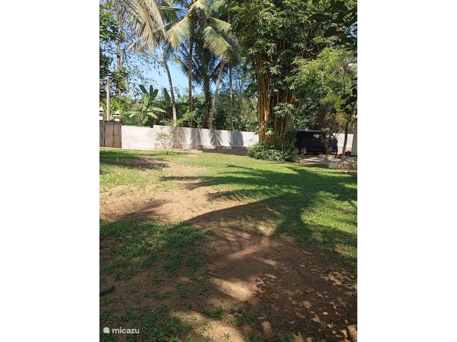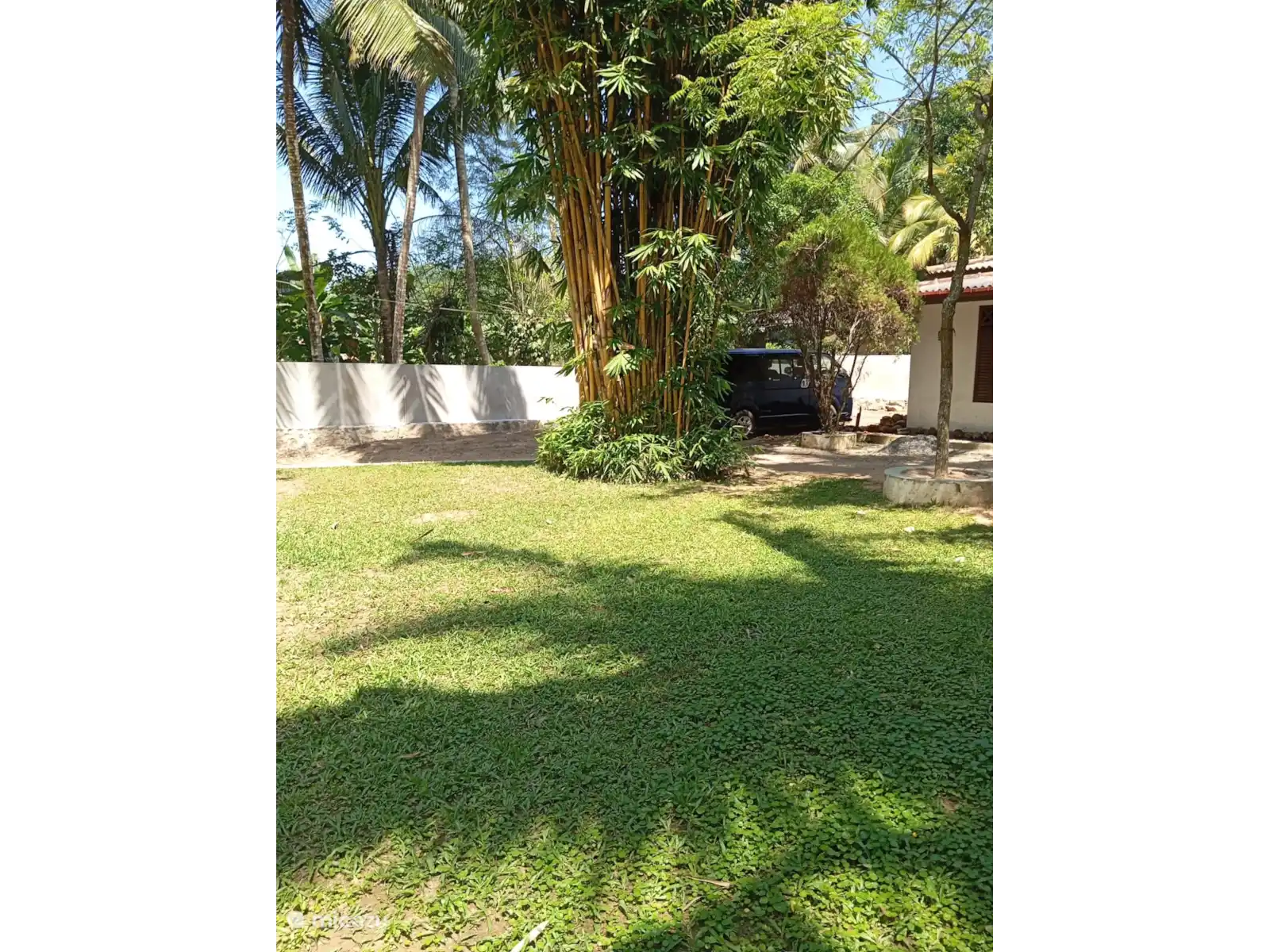 El jardín de la casa de vacaciones Meepe es espacioso y está maravillosamente protegido y tiene varias palmeras y plátanos.